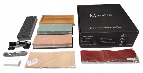 В наборе камней для заточки ножей также содержатся полезные аксессуары, которые еще больше улучшают процесс заточки, в том числе: в т.ч. бамбуковая основа с нескользящей подушечкой, угловая направляющая для заточки ножа, шлифовальный камень, две кожаные полоски для полировки кромок лезвий, небольшие тиски и зеленый воск для шлифовки поверхности камней.