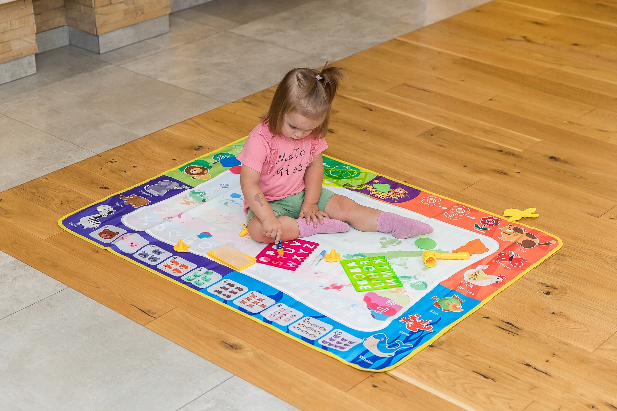 Помимо возможности бесплатного рисования, коврик также предлагает обучающие элементы. На его поверхности спрятаны буквы, цифры и геометрические фигуры, которые становятся видимыми после рисования водой, что позволяет учиться в игровой форме.