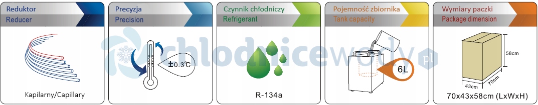 Chiller имеет хладагент R-134A для водяного охлаждения. Радиатор удерживает заданную температуру независимо от температуры комнаты, в которой он стоит. Обеспечивая такие условия, параметры работы устройства пользователя стабильны.