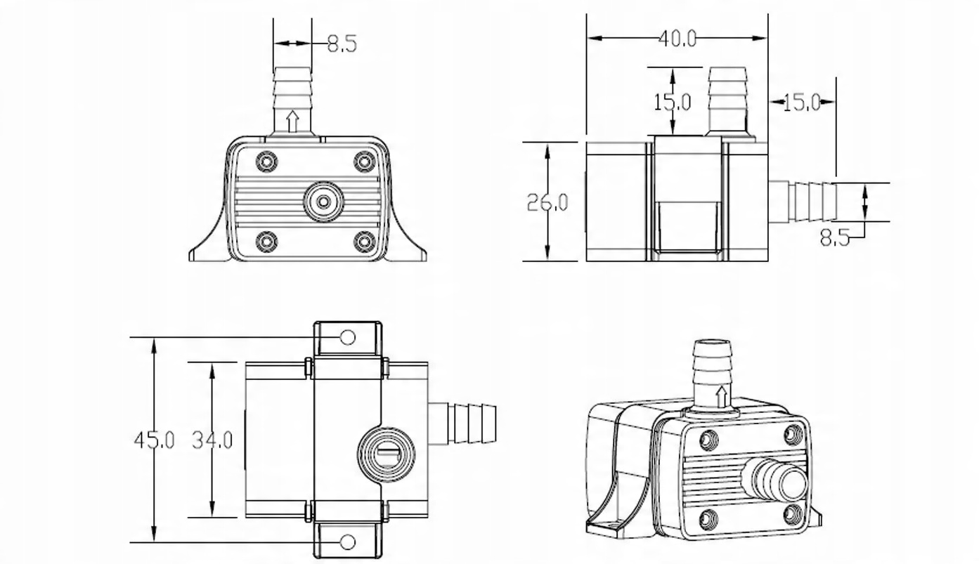 Может перекачивать воду на высоту до 3м. Он отличается небольшими размерами, а бесщеточный двигатель обеспечивает тихую и безаварийную работу. Он питается от 12В. В комплект входит ручка с отверстиями для прикручивания.