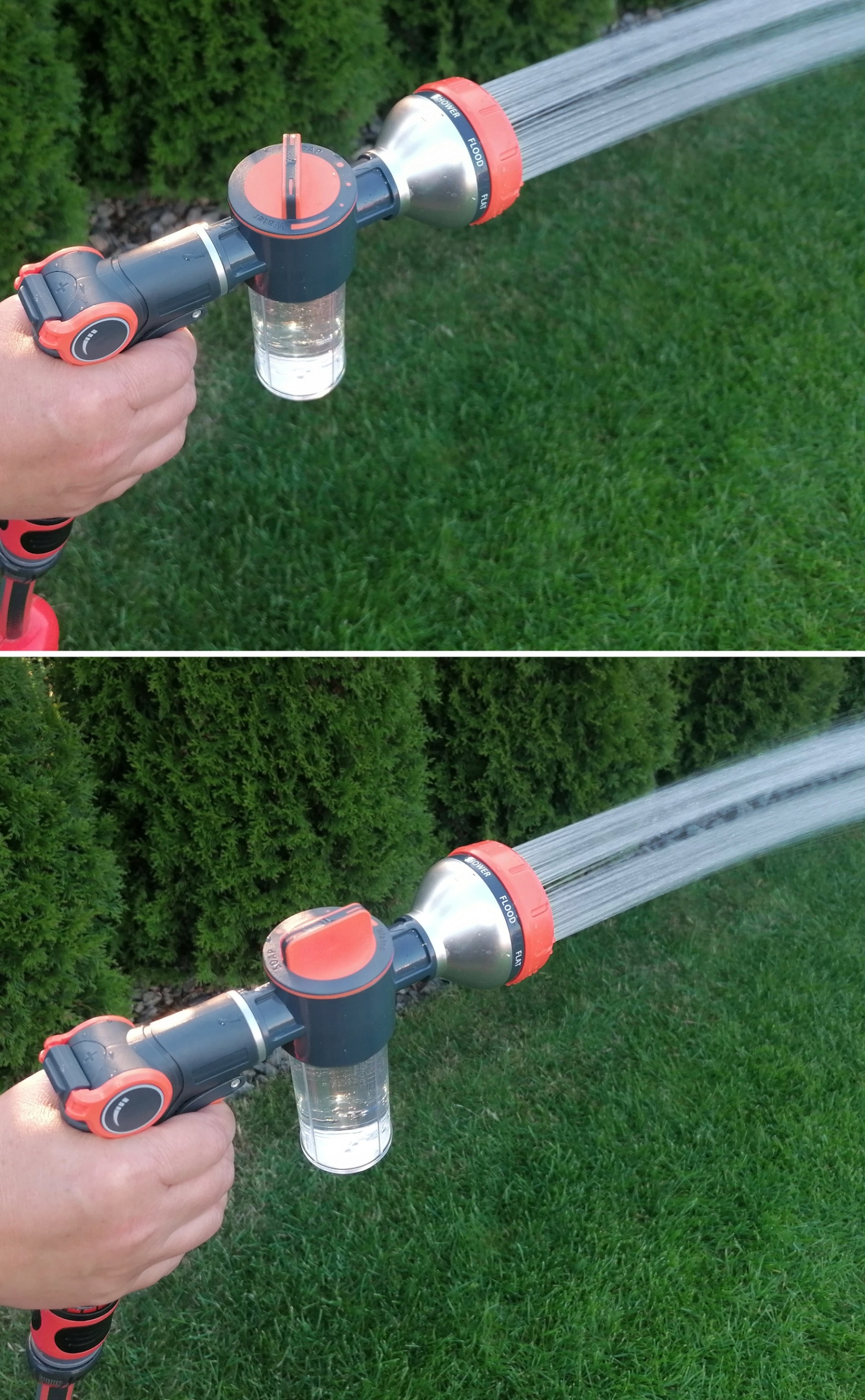 Многофункциональный садовый пистолет с дозатором – идеальное решение при использовании моющего средства или жидких удобрений. Шкала на дозаторе облегчает дозирование.