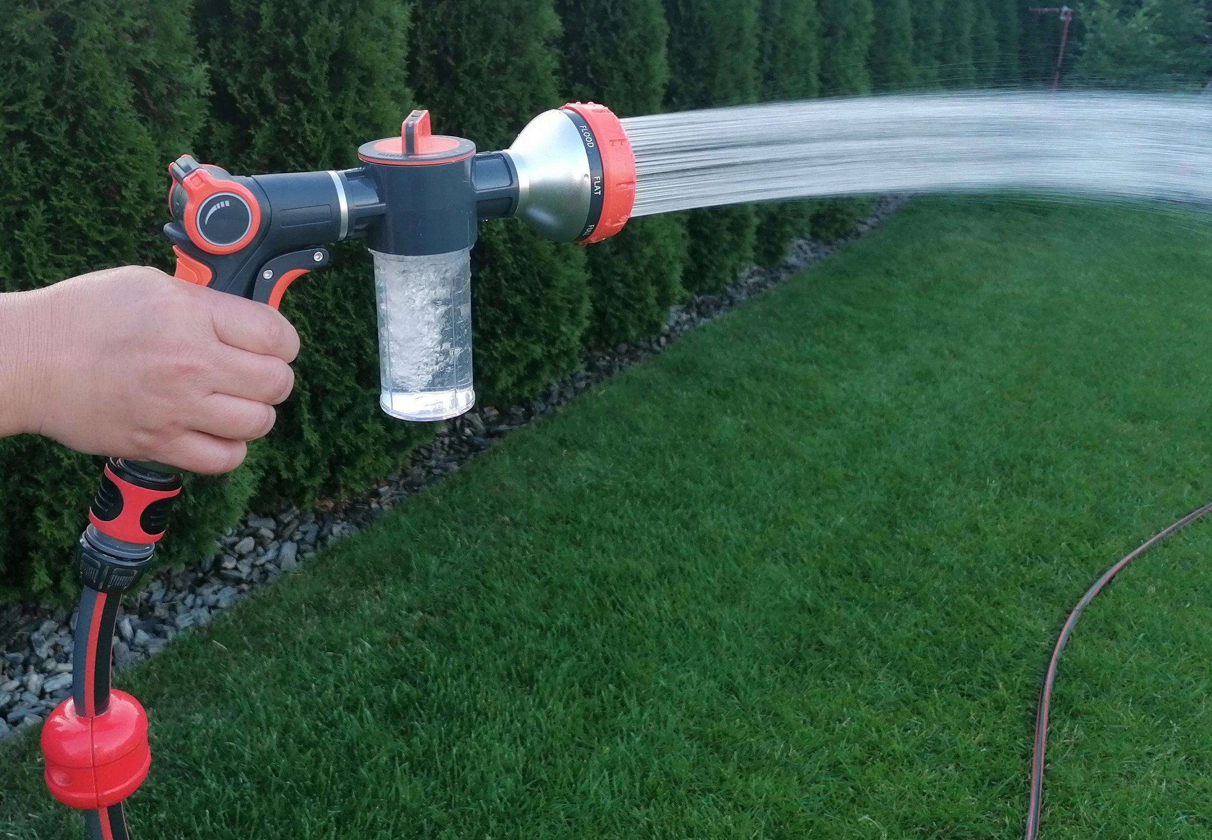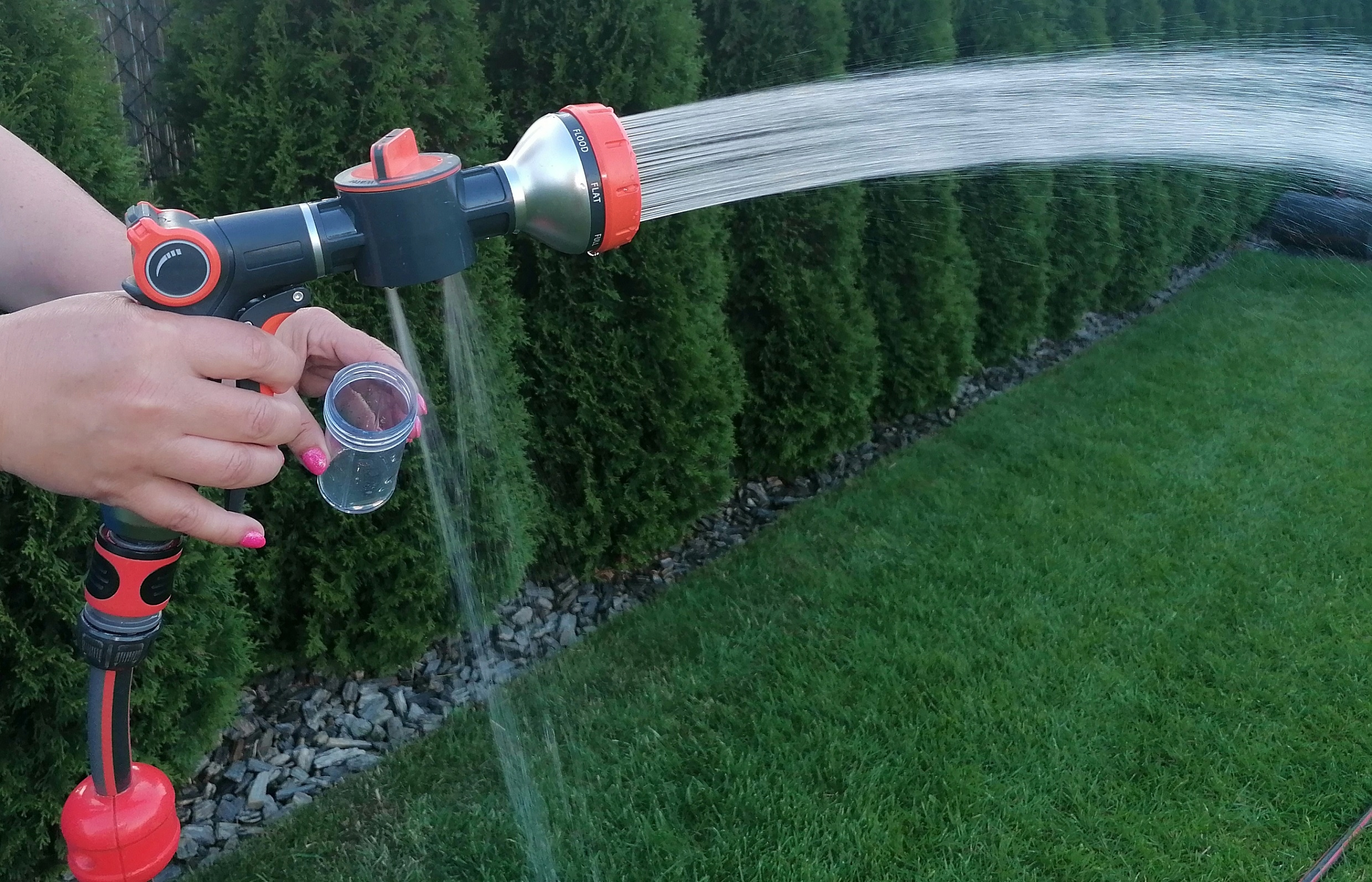 Дозатор смешивает жидкость с водой, а жидкость с вода под давлением, можно поливать, например, газон и т. д.