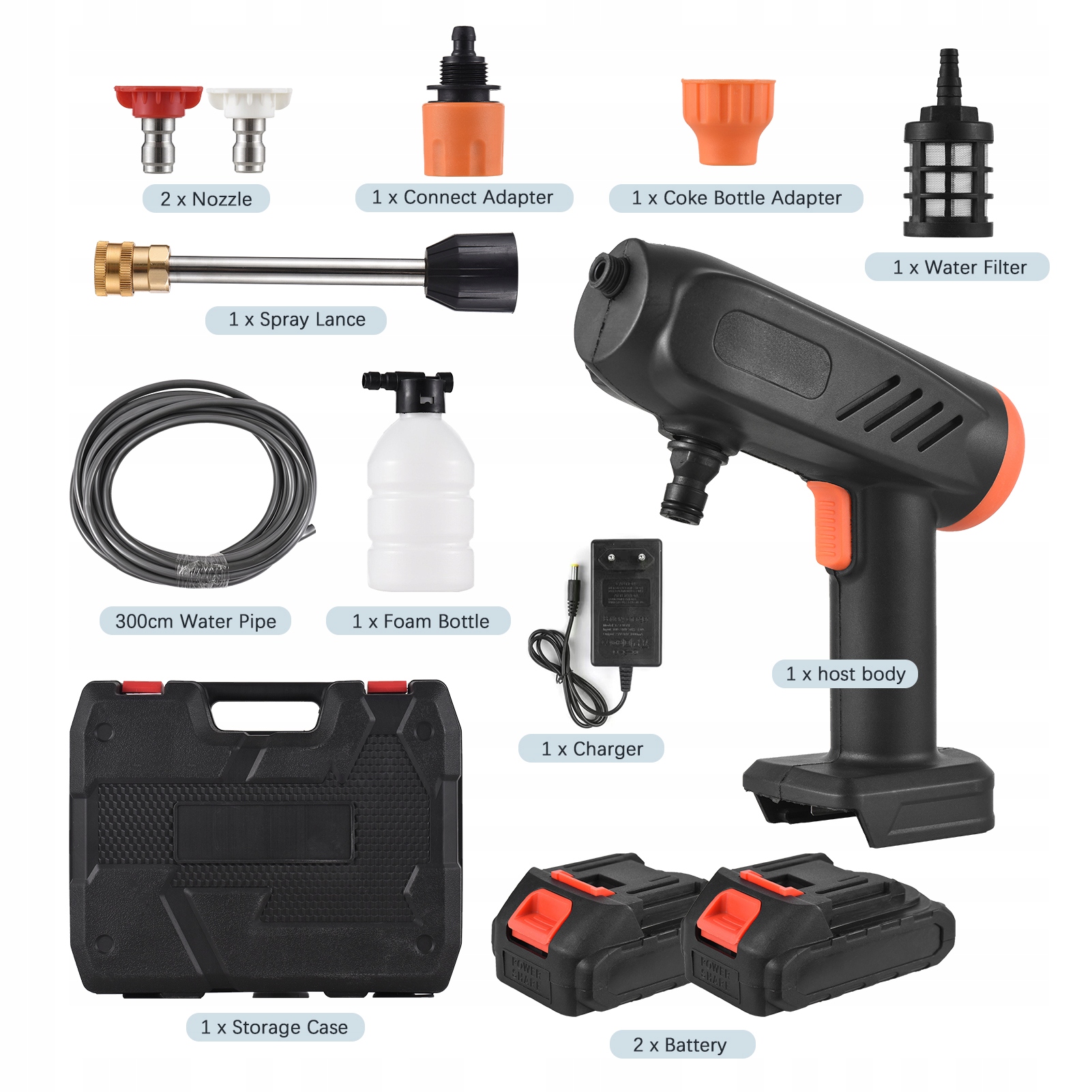 ▶ Мойка высокого давления: беспроводная мойка высокого давления, но с двигателем мощностью 260 Вт, максимальным давлением воды 22 бар и расходом воды 4 л/мин. Достаточно мощный для эффективной и быстрой очистки. Используя быстроразъемный разъем, вы можете подключиться к садовому шлангу и за считанные минуты очистить автомобили, грузовики, мотоциклы, подъездные пути, заборы и велосипеды.