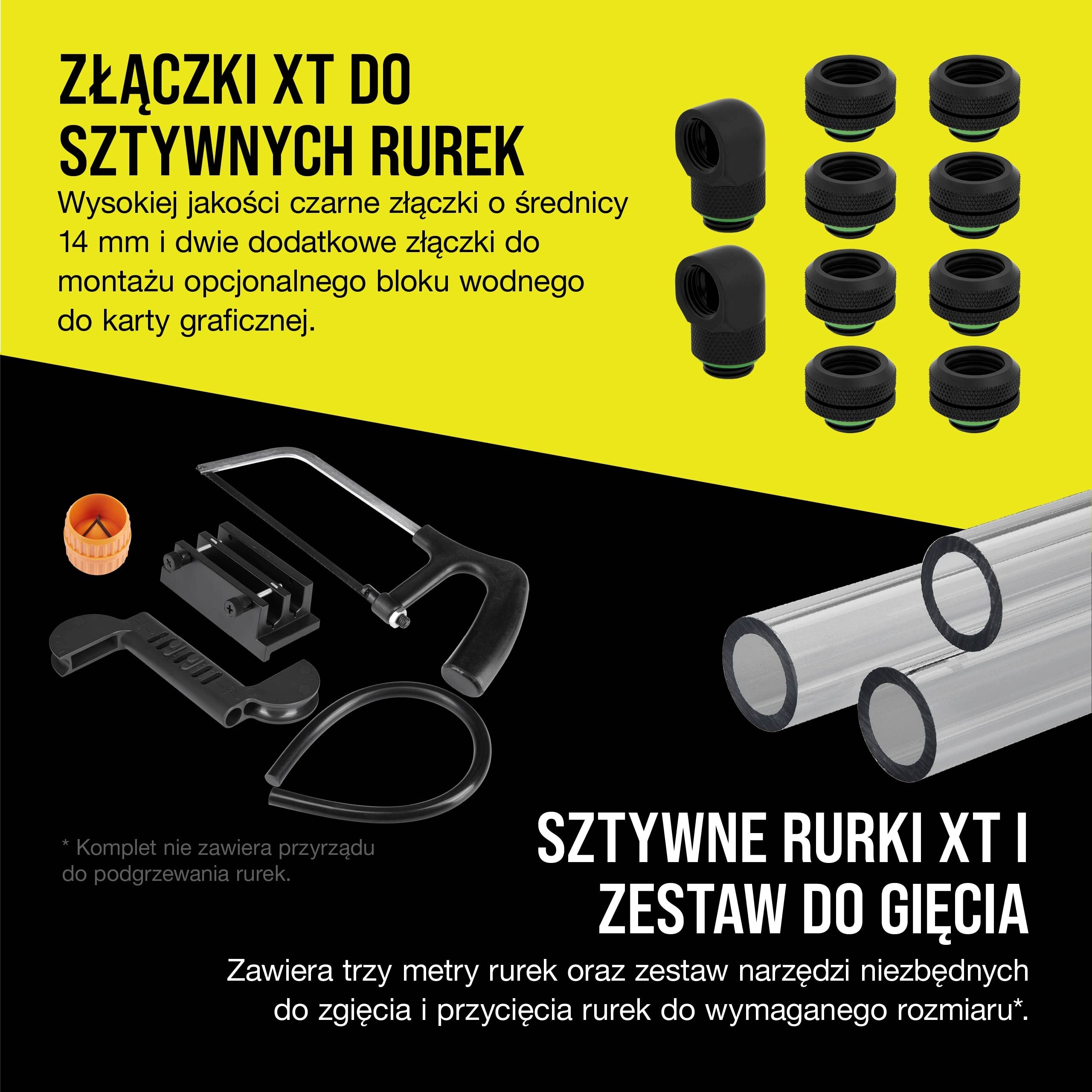 В комплект входит водоблок для процессора и компактная помпа с бачком — все элементы, необходимые для сборки кастомной системы охлаждения. Дополнительно в комплект входят инструменты для сгибания трубок и дополнительные разъемы для расширения системы охлаждения видеокарты. Благодаря этому вы сможете добиться еще большей производительности вашего компьютера!