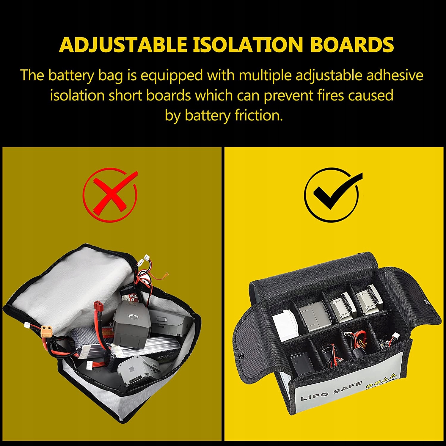 【УДОБНО】 Взрывозащищенный аккумуляторный мешок заполнен множеством коротких изолирующих пластин. Внутреннее пространство взрывозащищенной сумки можно свободно регулировать, чтобы батареи не терлись друг о друга во время транспортировки и не вызывали возгорания.