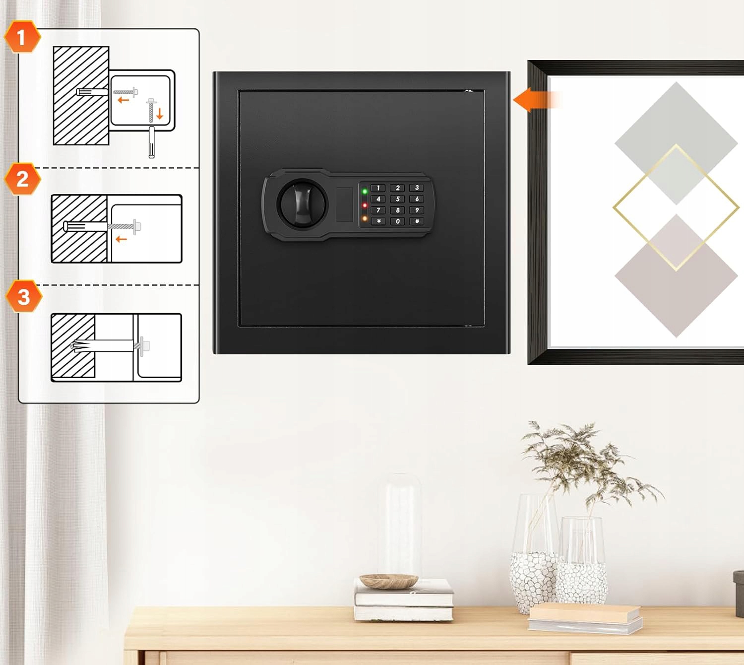 Safe имеет съемную полку, которая позволяет вам организовать пространство в соответствии с его собственными потребностями. Встроенная тревога активируется после нескольких неудачных попыток открытия или при несанкционированном доступе