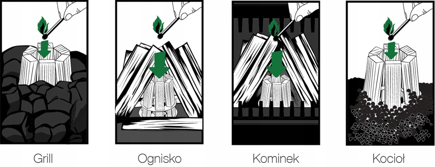 Поместите один экологический костер® в яму для костра большим основанием вниз. Заполните эко-костер® твердым количеством топлива со всех сторон на всю высоту. Бросьте зажженную спичку в эко-костер® (сверху) головкой вниз. Первоначально не закрывайте верхнюю часть огня. Залейте топливо, подождите несколько минут и... готово!