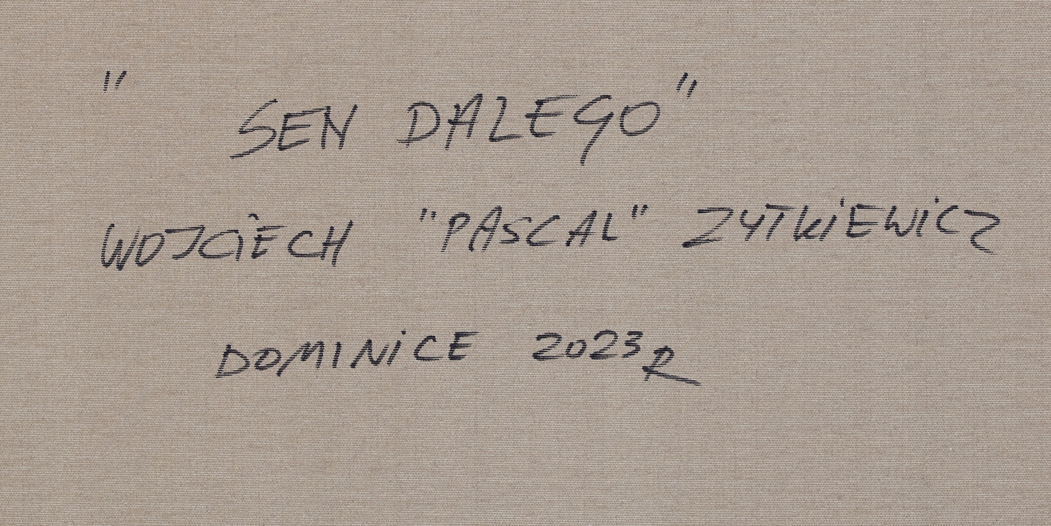 Техника: собственная техника на холсте. Работа подписана в правом нижнем углу: "ПАСКАЛЬ 23R". (оригинал, подпись автора). Дополнительно подписано, датировано и описано на оборотной стороне: «ГОСТЬ: КИНКА ВНУК-МОСКАЛЬСКА | «МЕЧТАЙТЕ ДАЛЬШЕ» | ВОЙЦЕХ «ПАСКАЛЬ» ЗИТКЕВИЧ | ДОМИНИС 2023R'