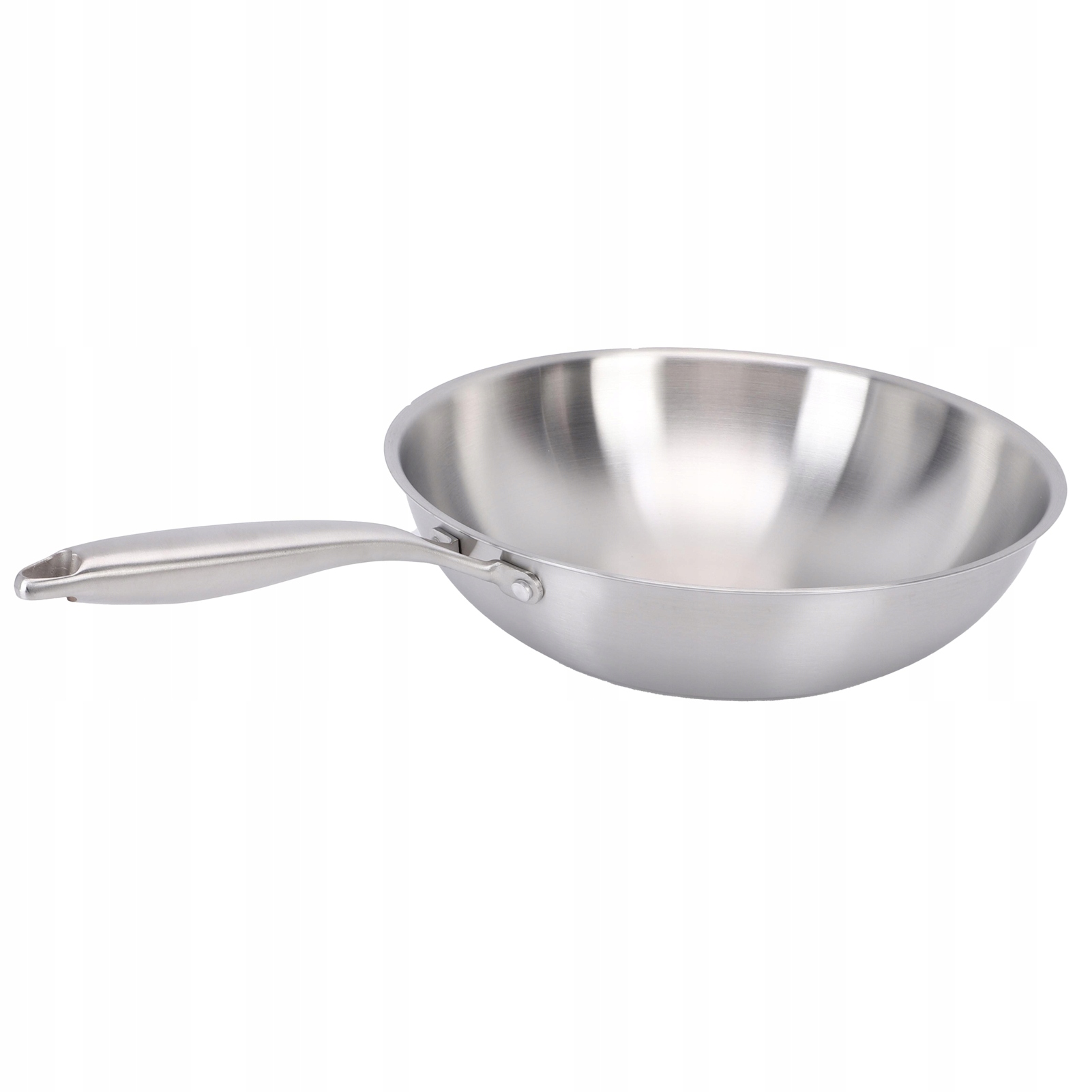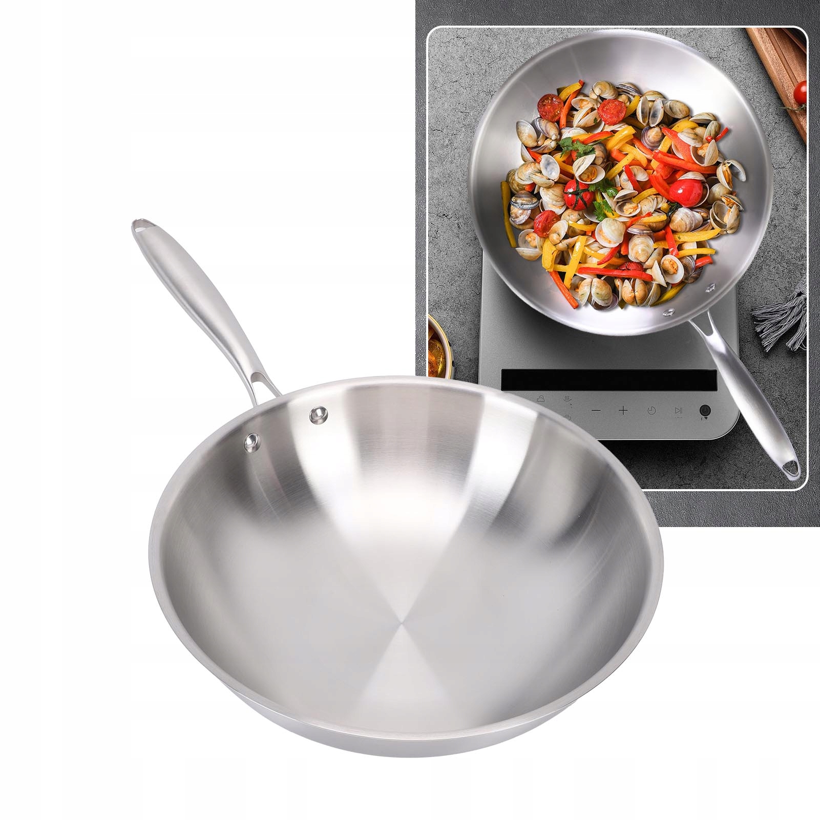 2. Эффективное распределение тепла: дно вока имеет алюминиевый сердечник с многослойной композитной структурой из нержавеющей стали, обеспечивающей быструю и равномерную теплопроводность. Внешний слой изготовлен из магнитной нержавеющей стали, что делает его универсальным для различных кулинарных нужд и экономит место на кухне.