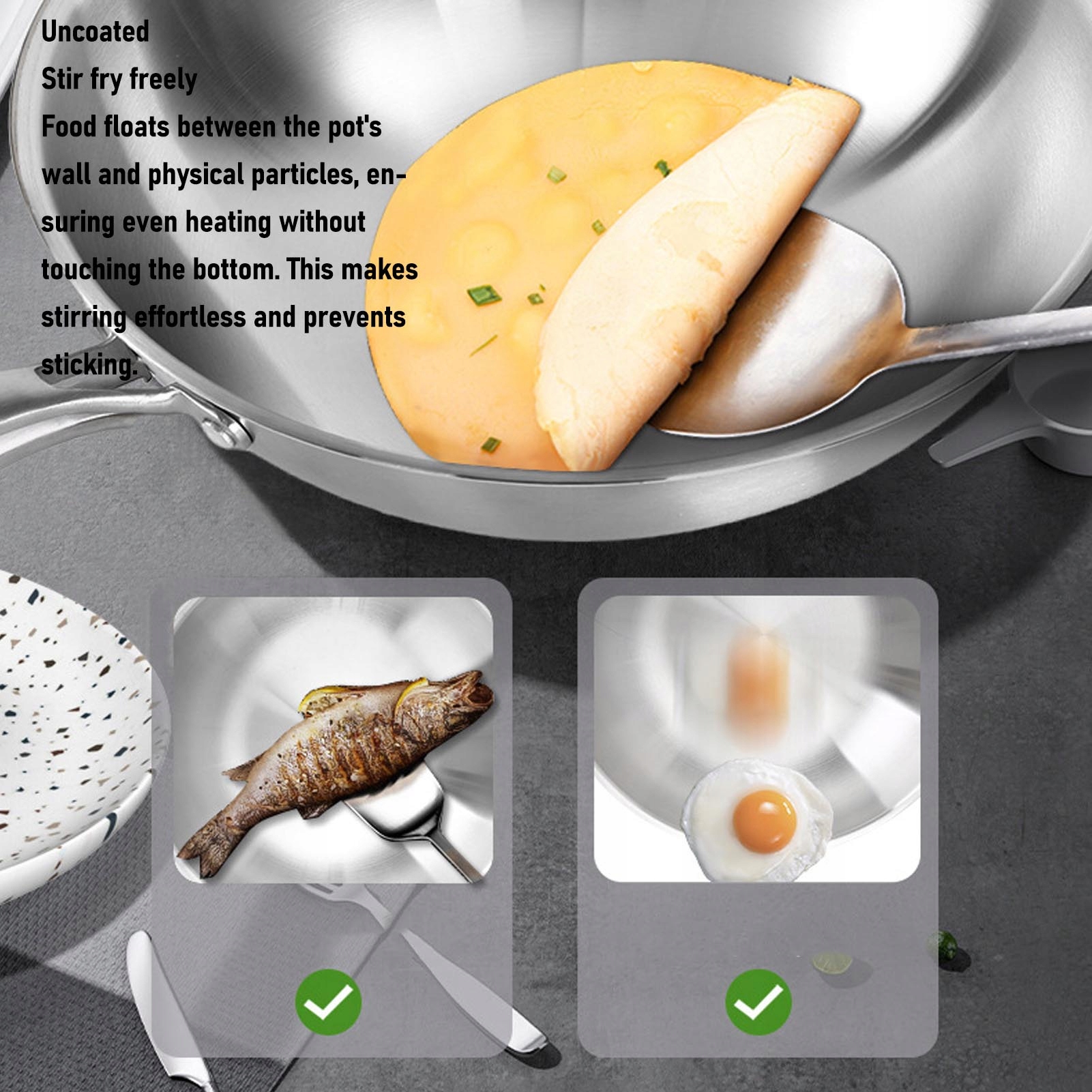 1. Материал из нержавеющей стали: этот вок изготовлен из цельной формованной пищевой нержавеющей стали 304 и не имеет покрытия из ПТФЭ или керамического покрытия, что гарантирует отсутствие выделения вредных веществ во время приготовления при высокой температуре. Не создает риска сколов покрытия, что делает его безопасным в использовании.