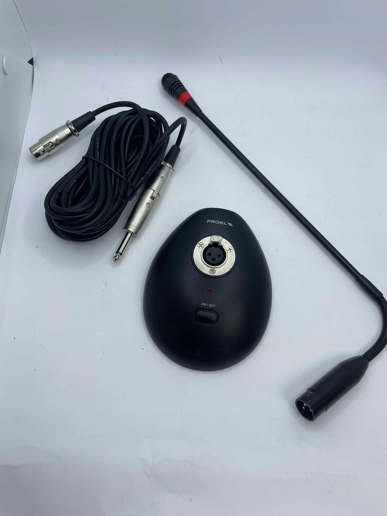 Proel PA BMG2 - профессиональный высокочувствительный настольный конденсаторный микрофон , оснащен гибкой стрелой, кольцом с подсветкой для индикации рабочего состояния и выключателем. Идеально подходит для всех приложений PA, таких как конференции и лекции. Может питаться от аккумулятора или фантома. База оснащена 8-метровым кабелем (в комплект входят моноадаптер XLRF-XLRM и моноадаптер XLRF-jack).