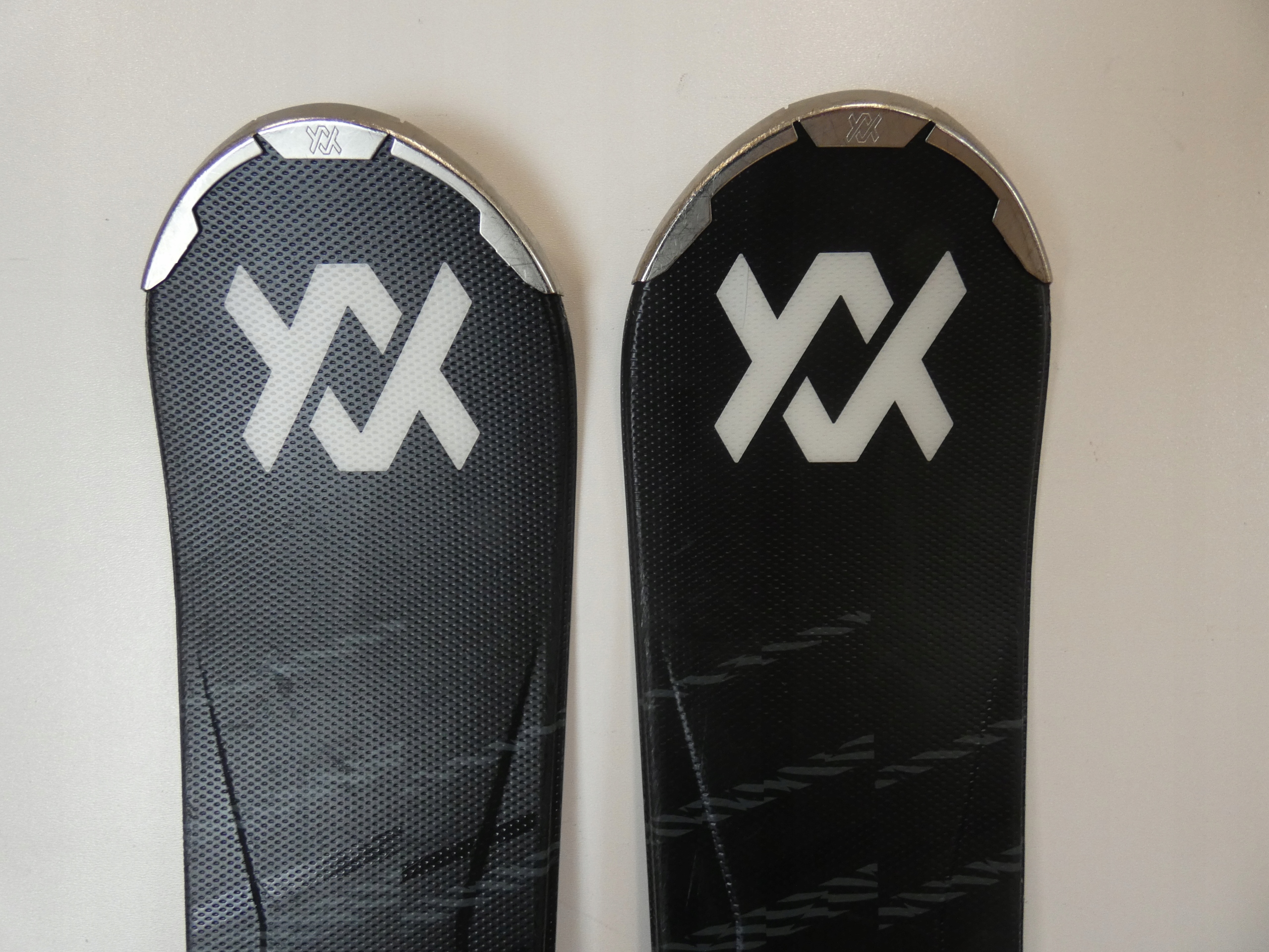 Следы обычного использования - мелкие царапины на графическом оформлении лыж и креплений