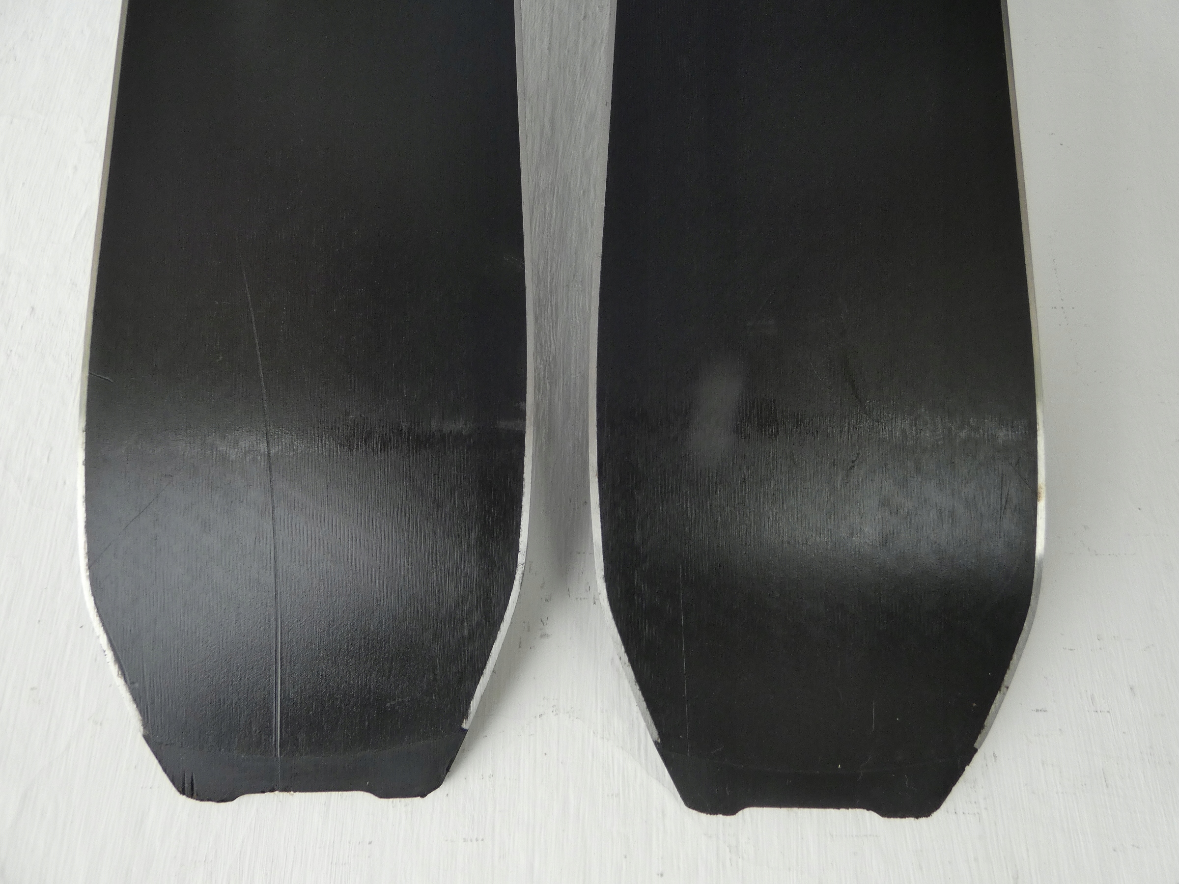 следы нормальной эксплуатации - мелкие эксплуатационные царапины и вмятины на графическом оформлении лыж и креплений.
