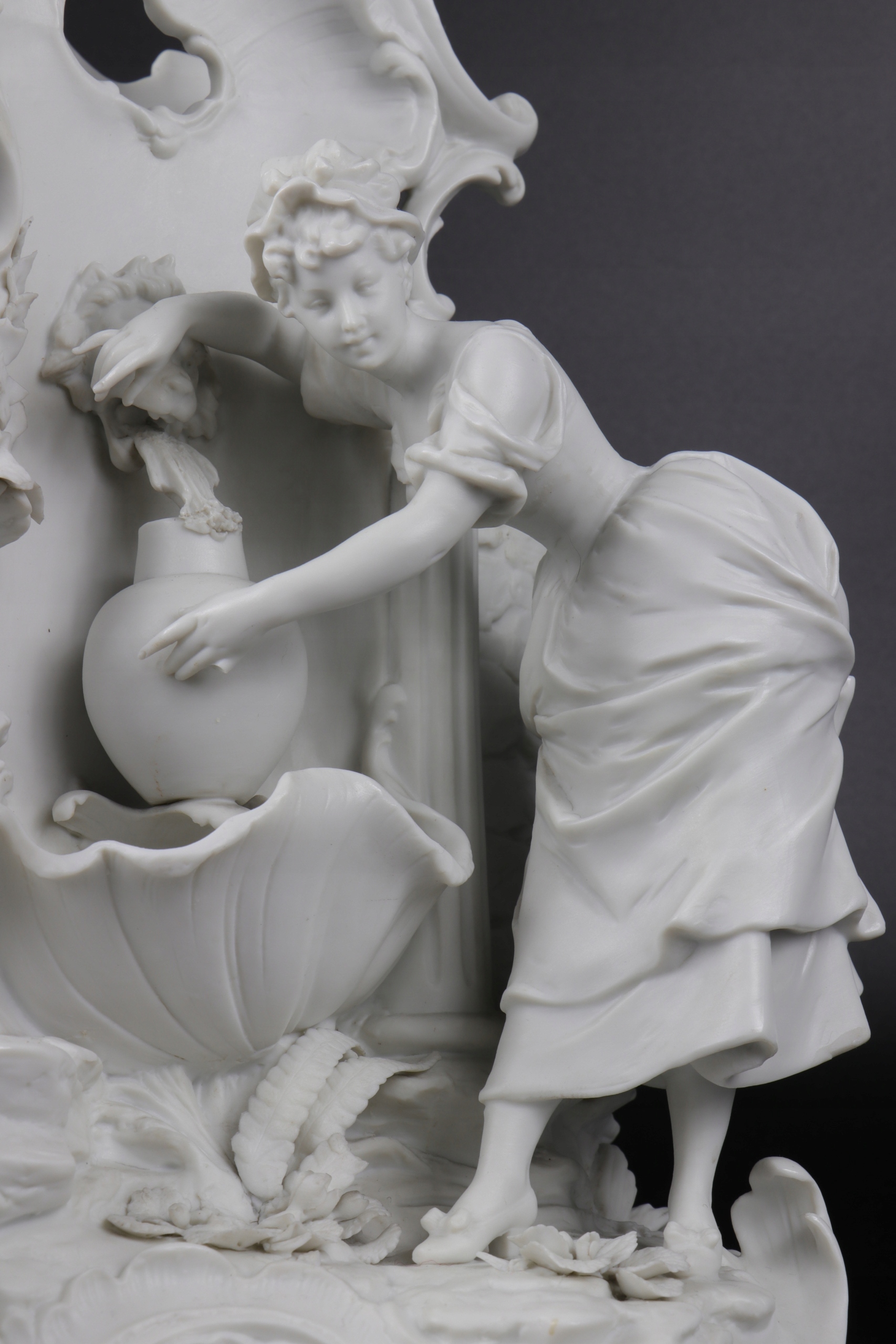 Фарфоровая епископская фигуральная ваза в источнике, подписанном с знаком Volkstedt Rudolstadt Thuringia. Справочник по кобальту внизу с номером 2092. Ваза прекрасно смоделирован в стиле рококо, сохраняя много деталей. Дата создания : 1894 1907