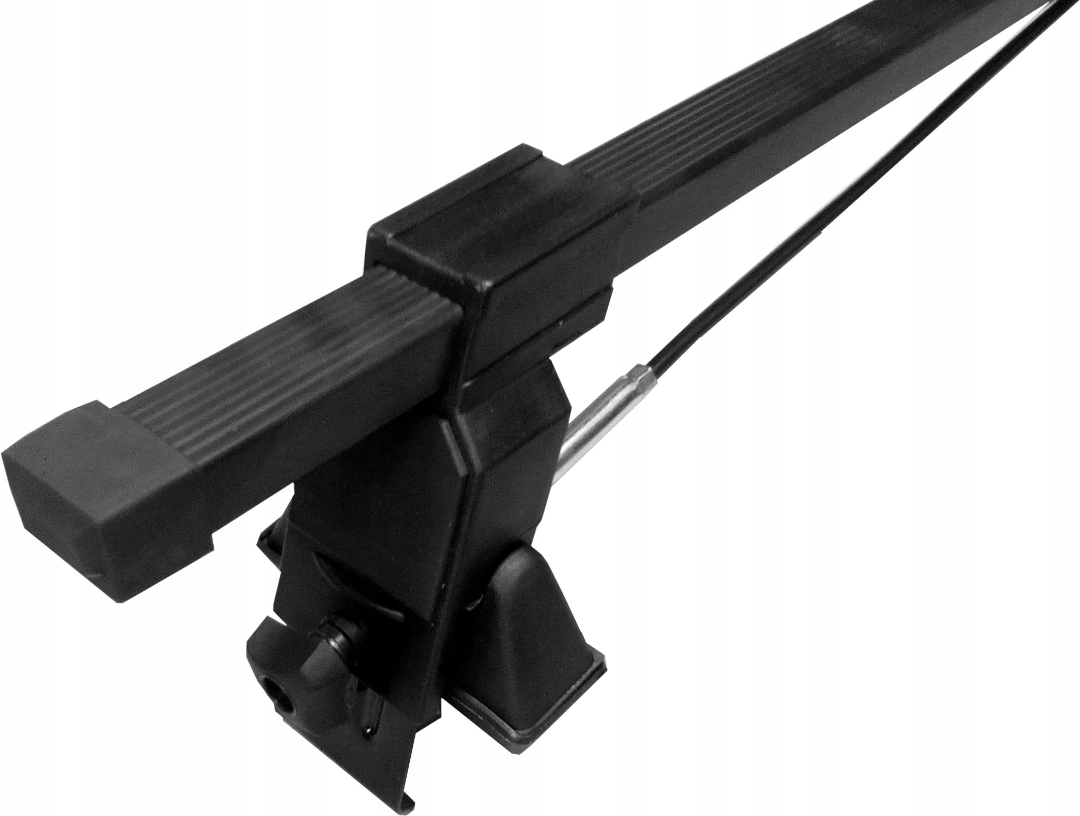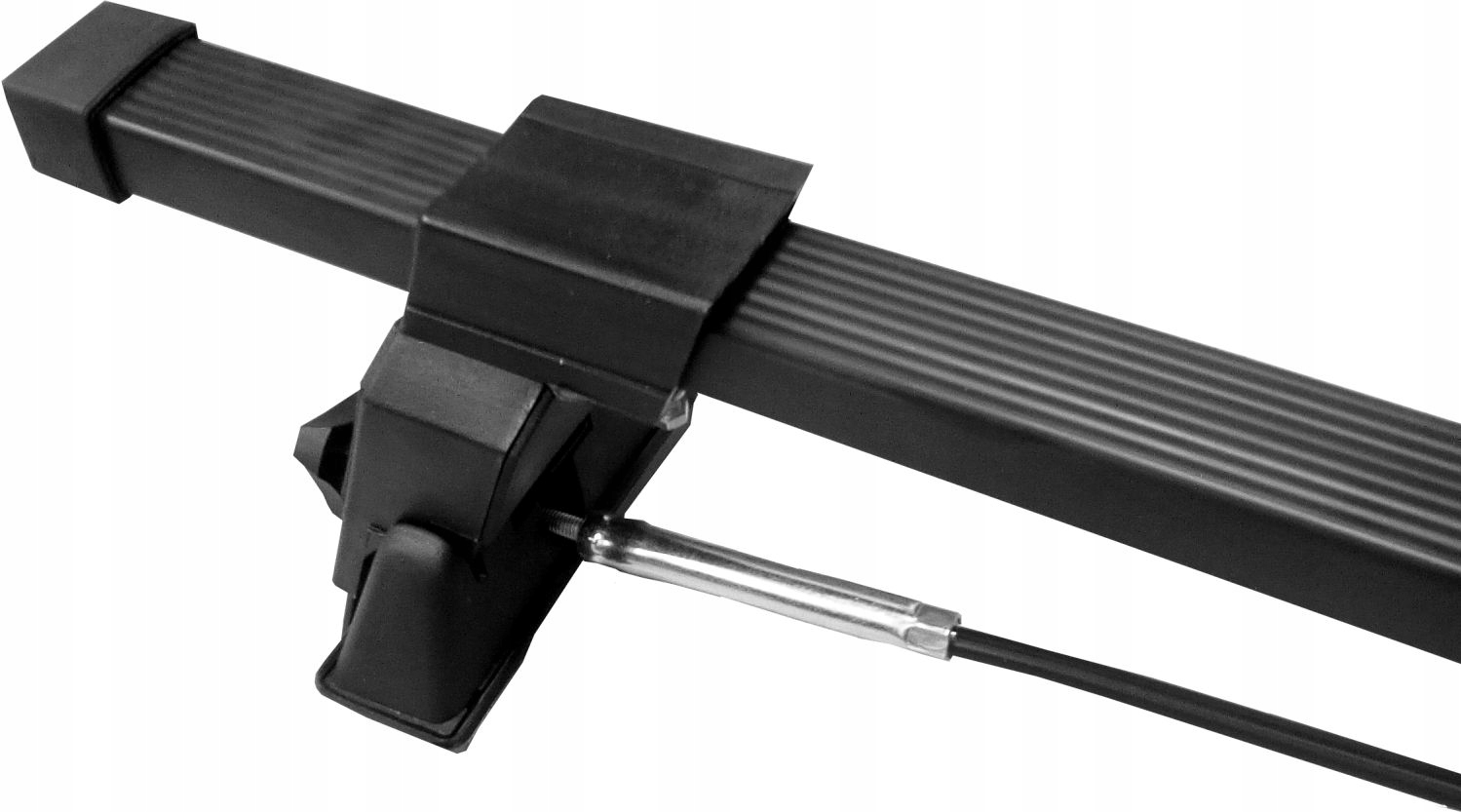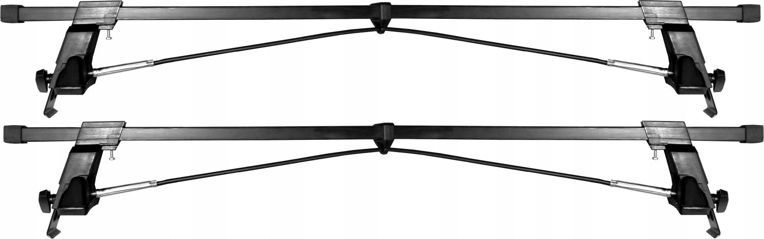 Представленный багажник состоит из прочных монтажных скоб, изготовленных из металла, обеспечивающих надежность крепления к крыше (через ее край) автомобиля, и двух стальных балок (в черном ПВХ-покрытии) с прямоугольное сечение 32х20мм. Весь комплект выполнен в универсальном черном цвете.