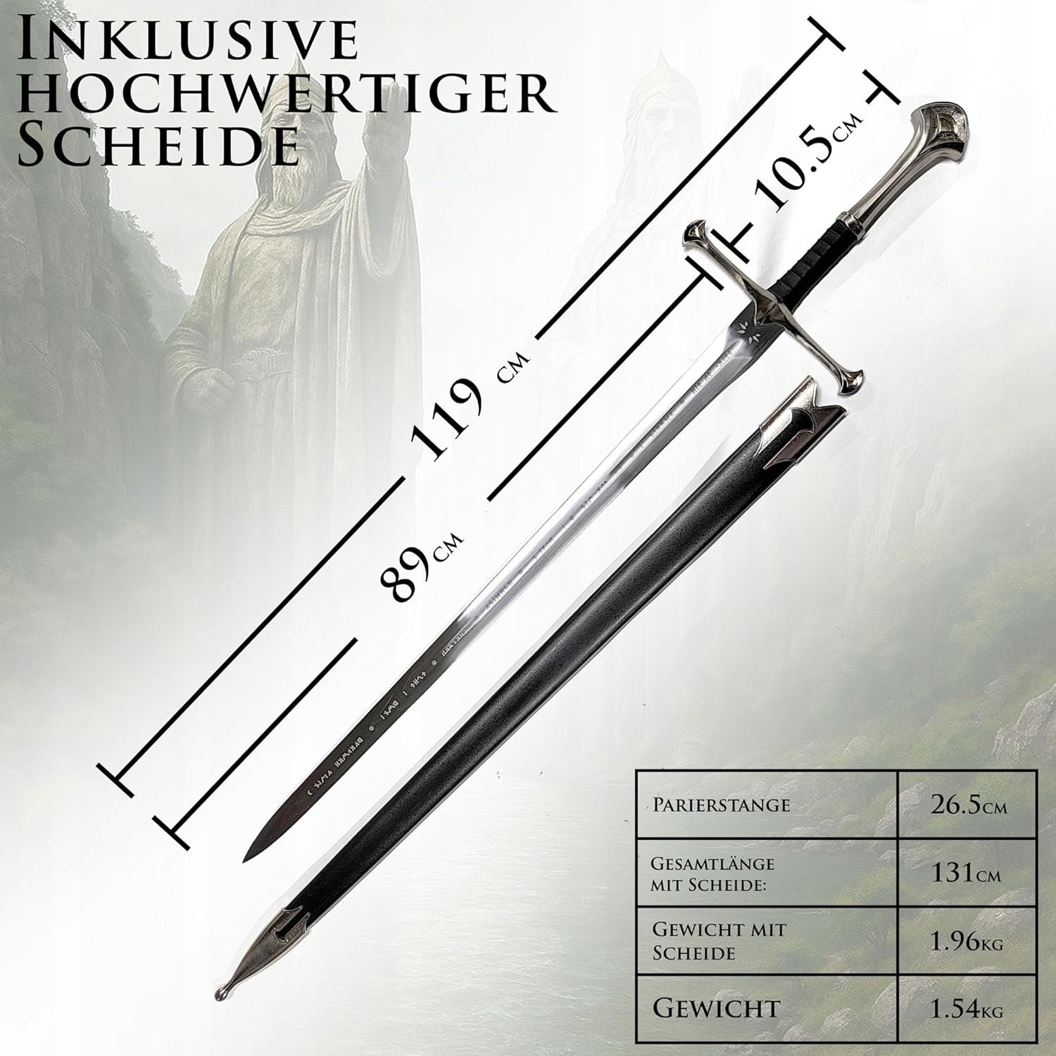 ОТЛИЧНЫЙ РАЗМЕР И ПОДЛИННЫЙ ВЕС: Благодаря впечатляющей общей длине 131 см (с ножнами) и солидному весу 1,96 кг этот меч выглядит массивным и вызывает уважение. Он драгоценный и сбалансированный, как и подобает королевскому мечу.
