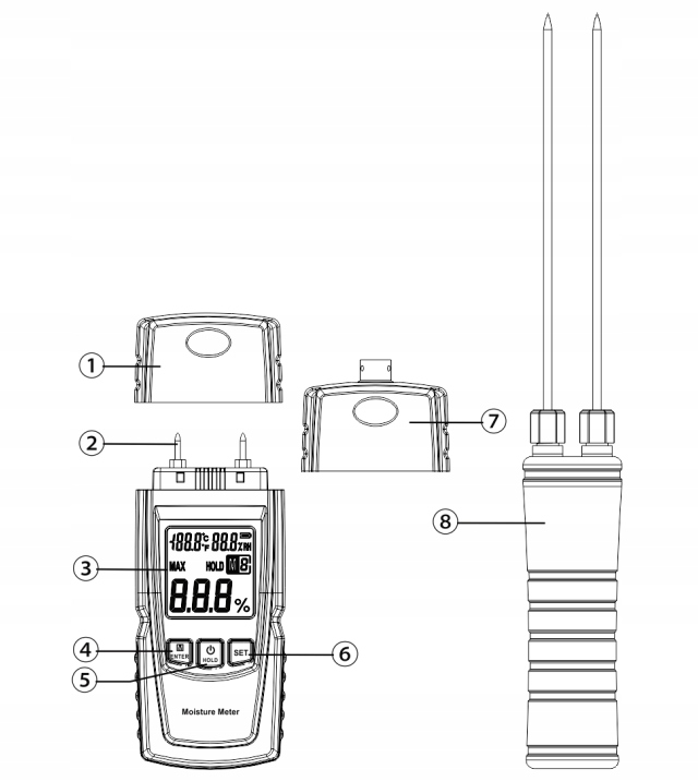 - Комплектация: Влагомер древесины, соединительный кабель, зонд (2 шт.), руководство пользователя PL, заводская упаковка.