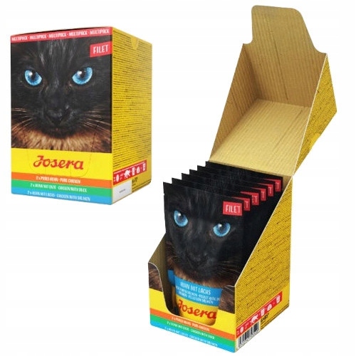 JOSERA Multipack – идеальное решение для кошек, ценителей хорошей еды, ценящих разнообразие. Мультипакет с филе содержит 2 курицы, 2 курицы с уткой и 2 курицы с лососем.