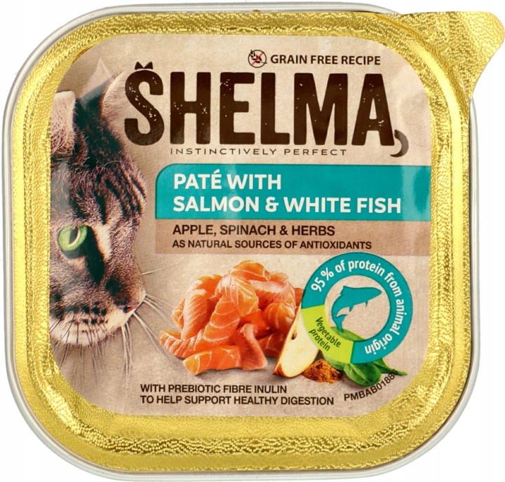 Потлета для взрослых кошек с лососем и белой рыбой с яблоком, шпинатом и куркумой.