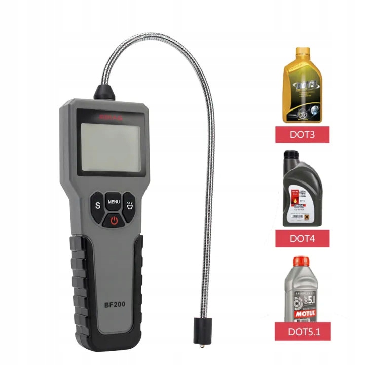 - Тестер тормозной жидкости используется для проверки трех распространенных типов тормозной жидкости: DOT3, DOT4 и DOT5.1. Чистота тормозной жидкости хорошо видна на экране. Если тормозная жидкость содержит более 3–4 % воды, мигает фоновый индикатор и раздается звуковой сигнал.