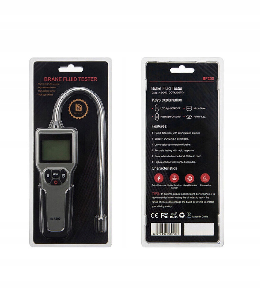 - Тестер тормозной жидкости подходит для проверки уровня влажности тормозной жидкости автомобилей, мотоциклов и грузовиков, чтобы избежать влияния высокой влажности на эффективность торможения. в тормозную жидкость и напоминайте владельцам о необходимости своевременной замены тормозной жидкости.