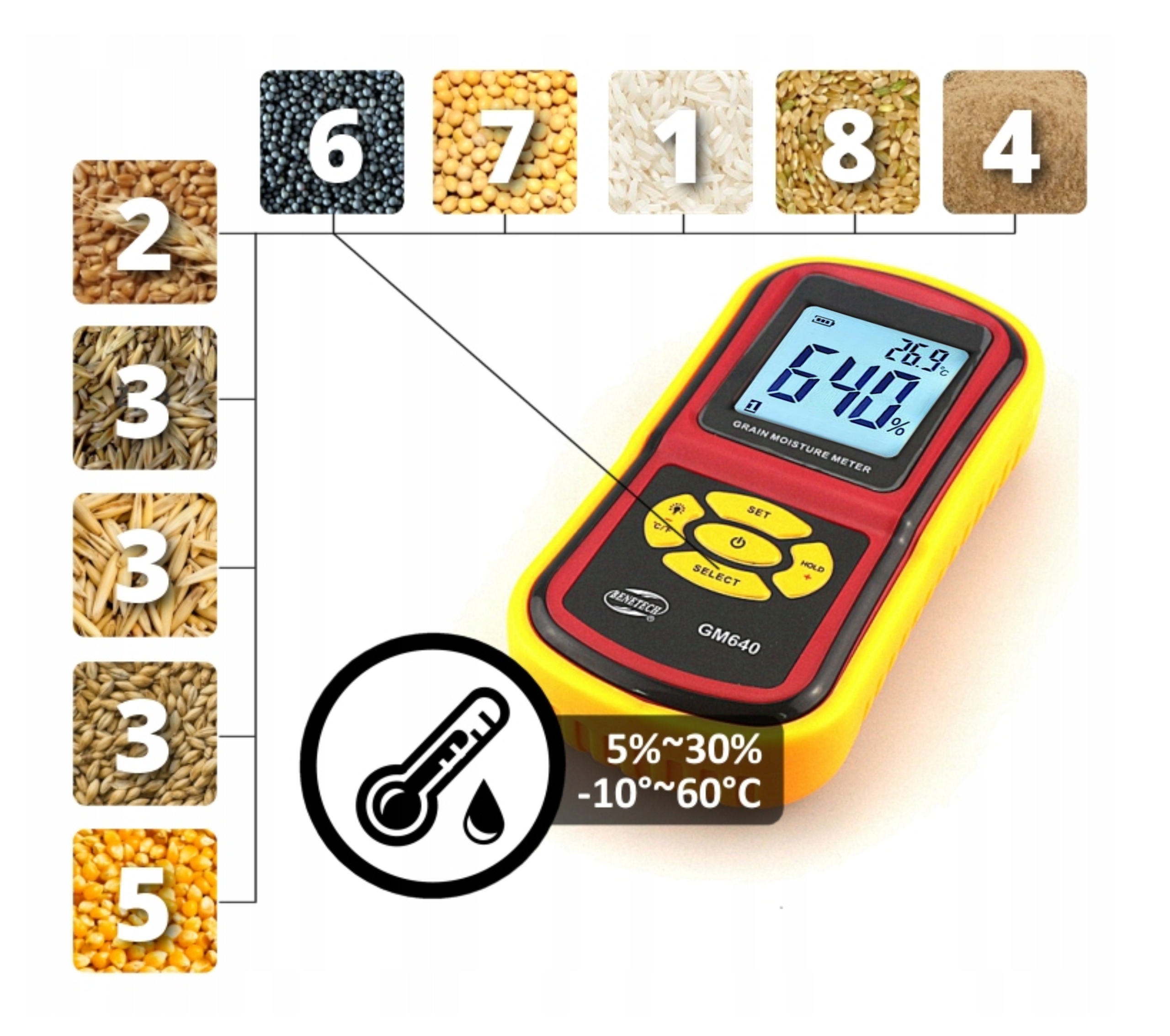 Влагомер GM640 – это универсальный и удобный прибор, предназначенный для измерения влажности и температуры пшеницы, ржи, овса, ячменя, кукурузы, рапса, сои, риса, кормов для животных и т. д.