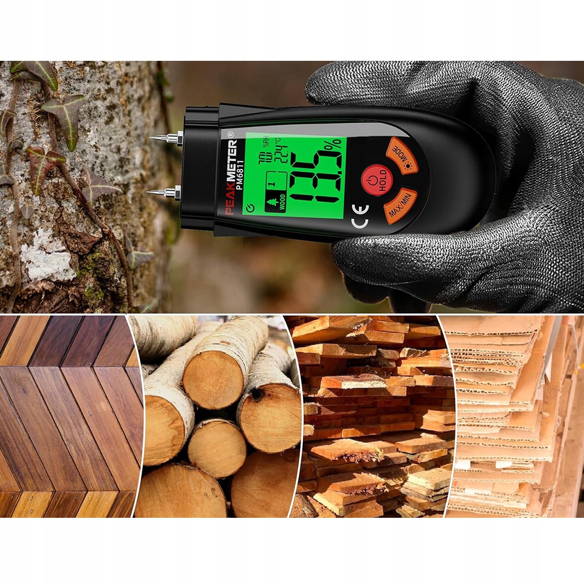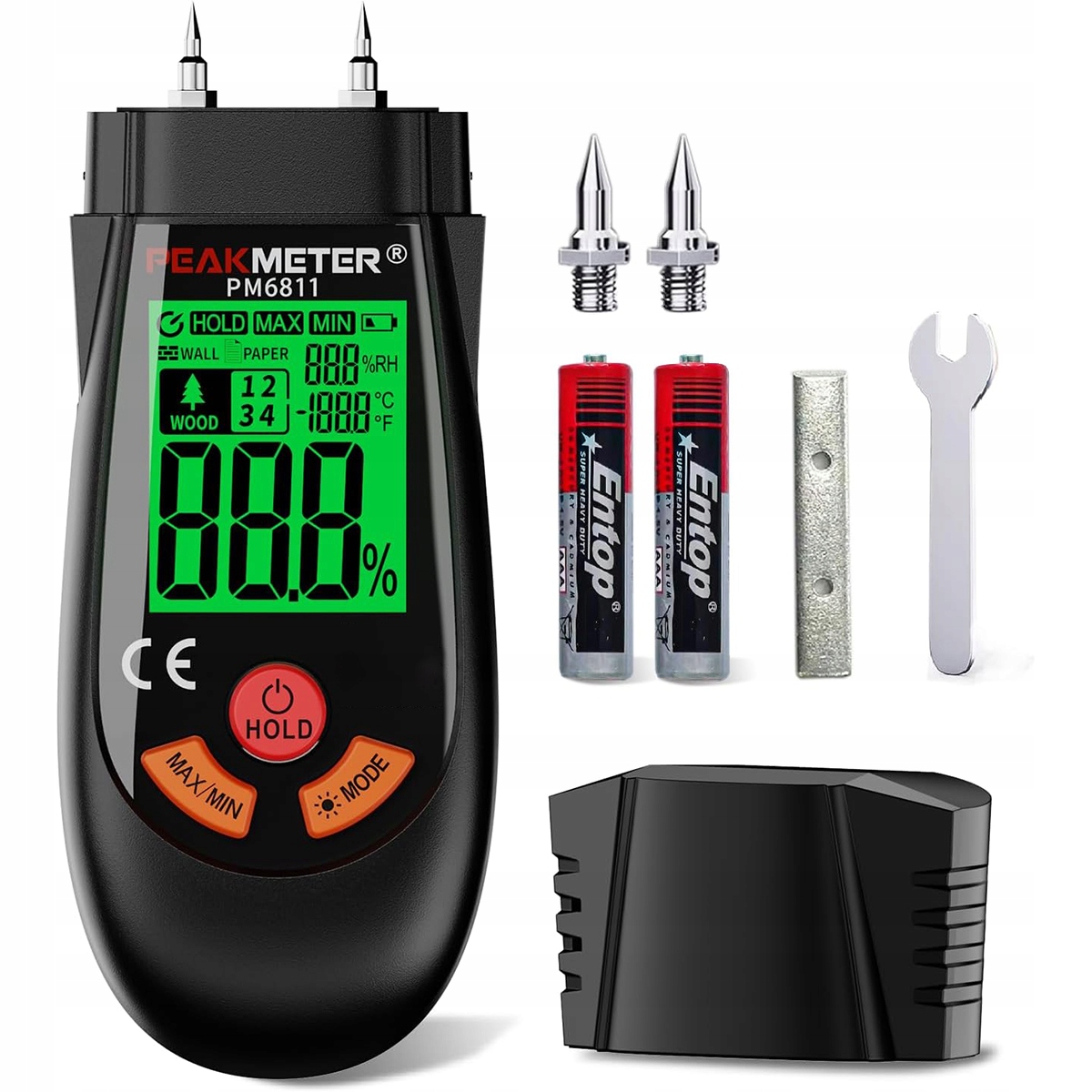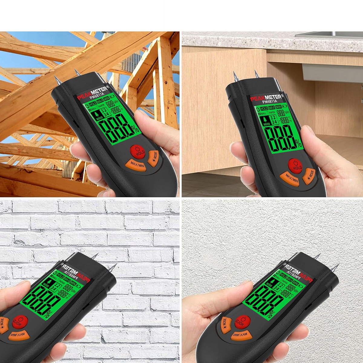 Влагомер PEAKMETER PM6811A был недавно модернизирован, в него добавлены датчики температуры, влажности и зуммер. функции, позволяющие быстро измерять различные виды древесины, бумаги, строительного раствора, фанеры, оштукатуренных стен, полы и т. д.