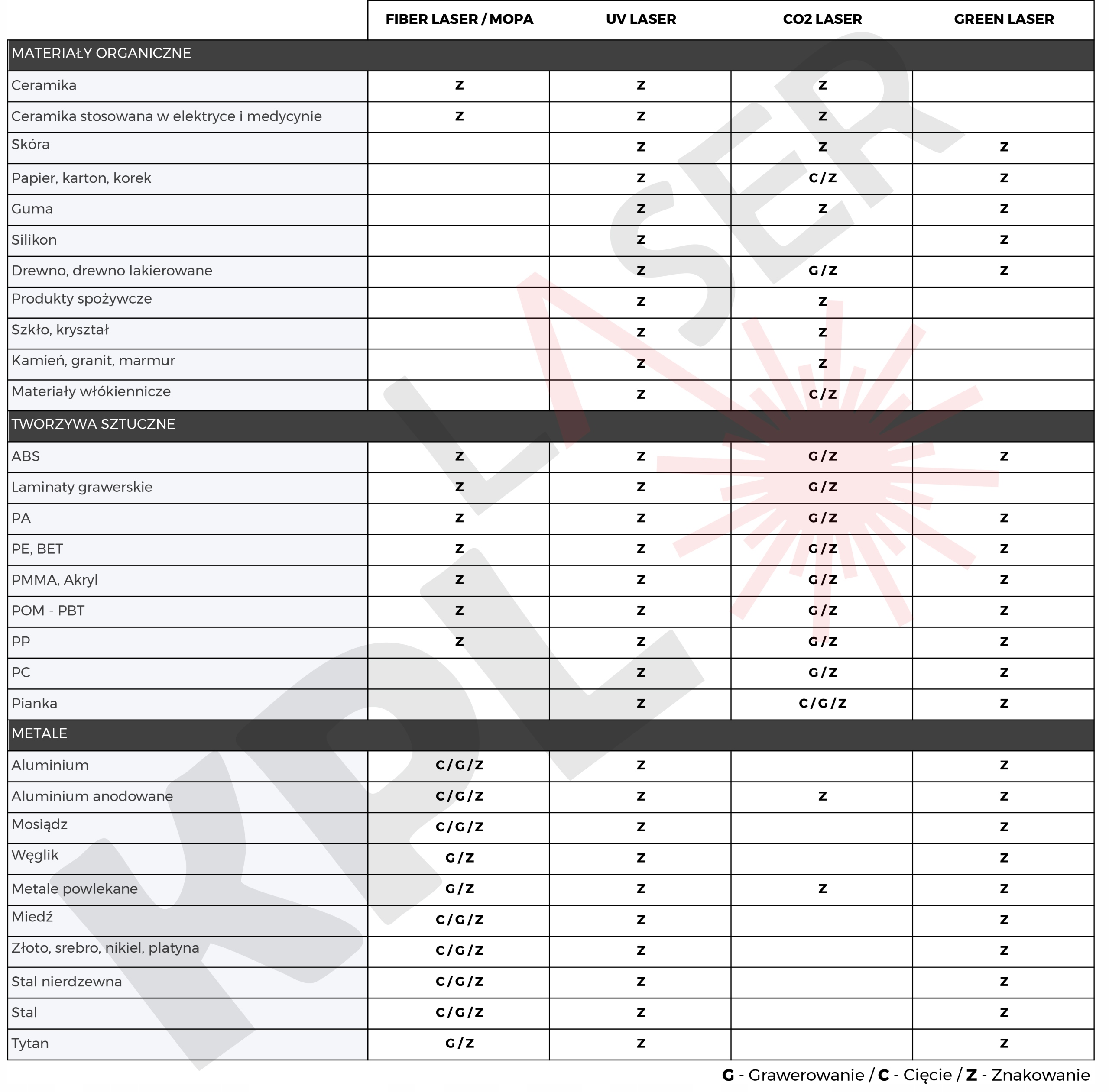 ниже возможное использование на материалах - (см. Fibre Laser / Column Column) < / H2>