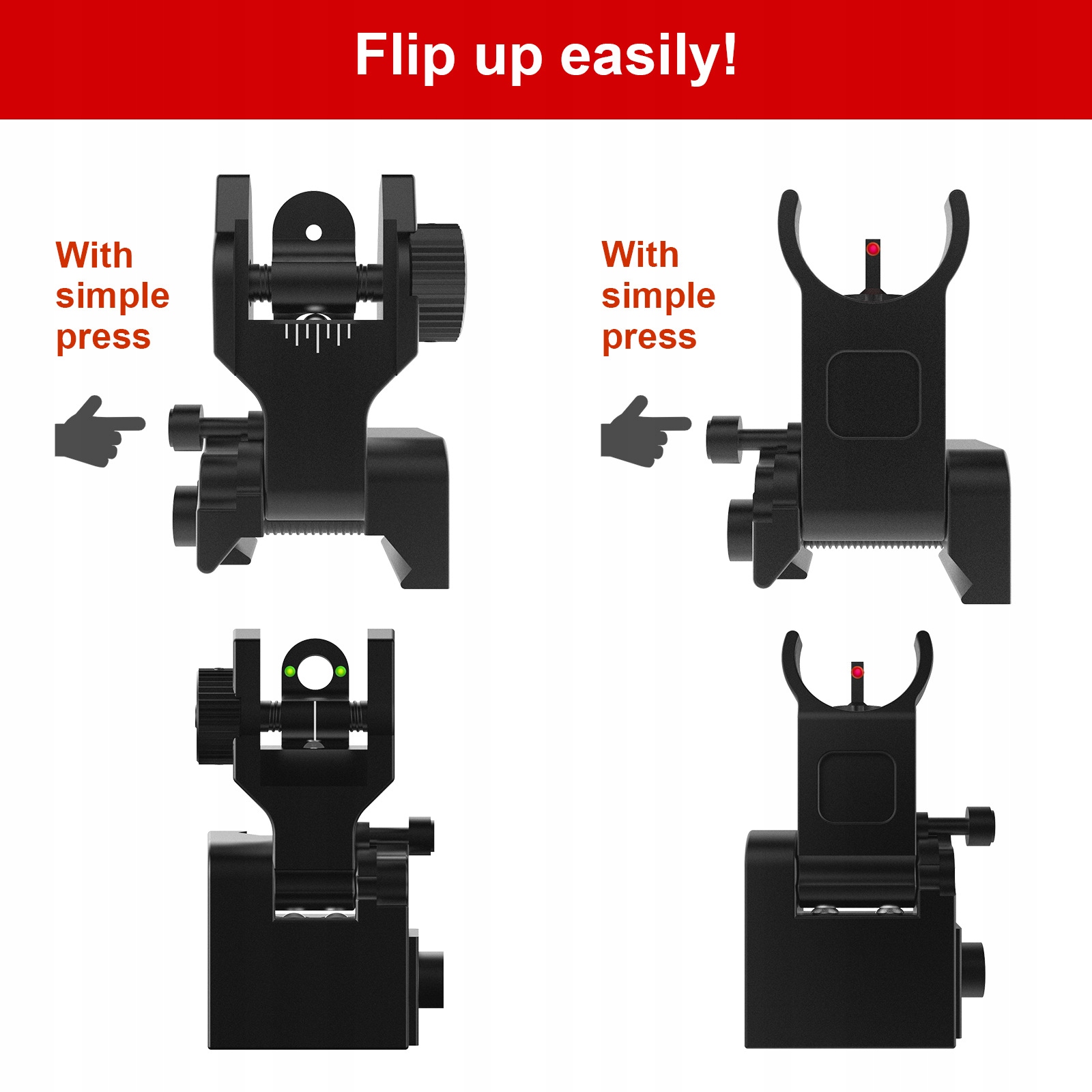 ● Надежный фиксирующий механизм на шарикоподшипниках, двойные отверстия и низкопрофильная складная конструкция для быстрого прицеливания.