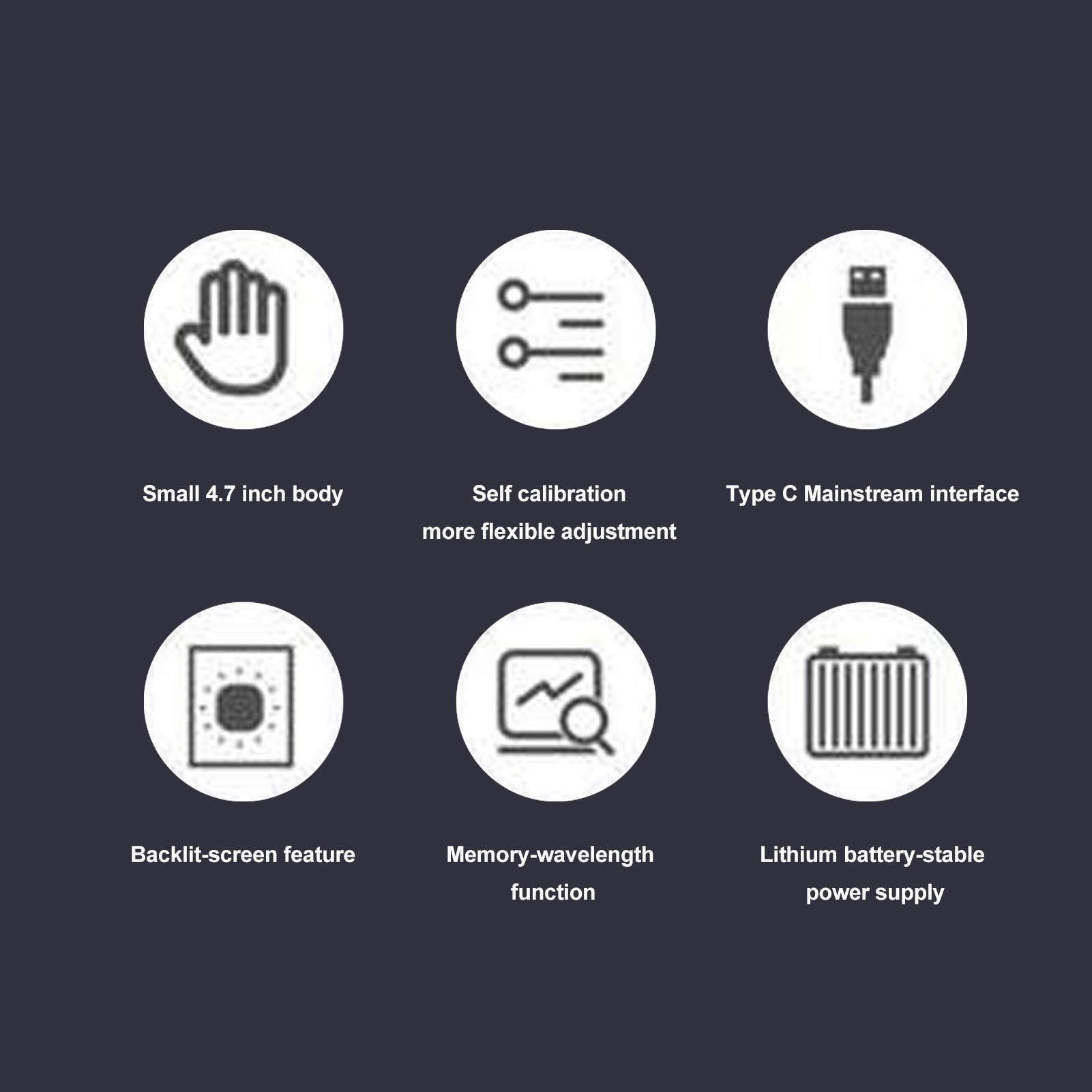 2. Различные функции: Универсальный оптоволоконный измеритель мощности имеет компактный внешний вид, функцию автоматического питания, регулируемый источник питания, функцию памяти длины волны, автоматическое распознавание рабочей частоты, поддержку освещения, хранения и другие функции.