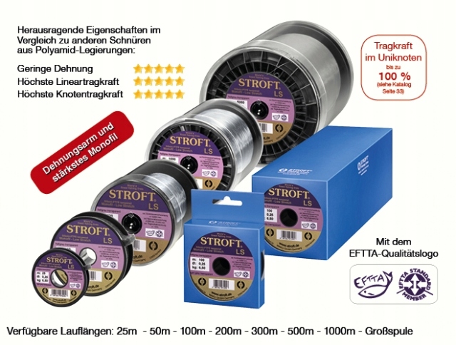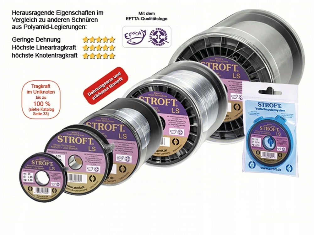 По нашему мнению, STROFT — одна из лучших веревок из нейлона и фторуглерода в мире. Леска LS изготовлена из специальной смеси полиамидов, поэтому леска практически не растягивается, но при этом чрезвычайно прочна. Теперь это доступно в новой линейке нейлона STROFT под названием LS (Low Stretch). По проведенным испытаниям меньшим удлинением обладают только крученые канаты.
