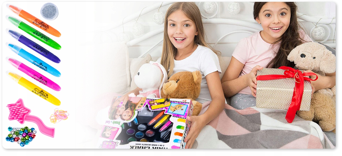 Этот набор позволяет создавать сумасшедшие прически и татуировки за несколько минут. Вся используемая косметика безопасна и легко моется с водой!