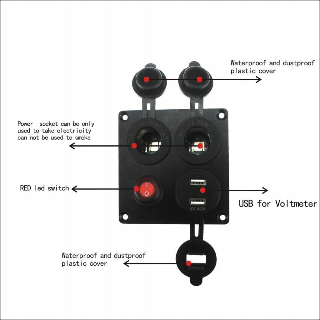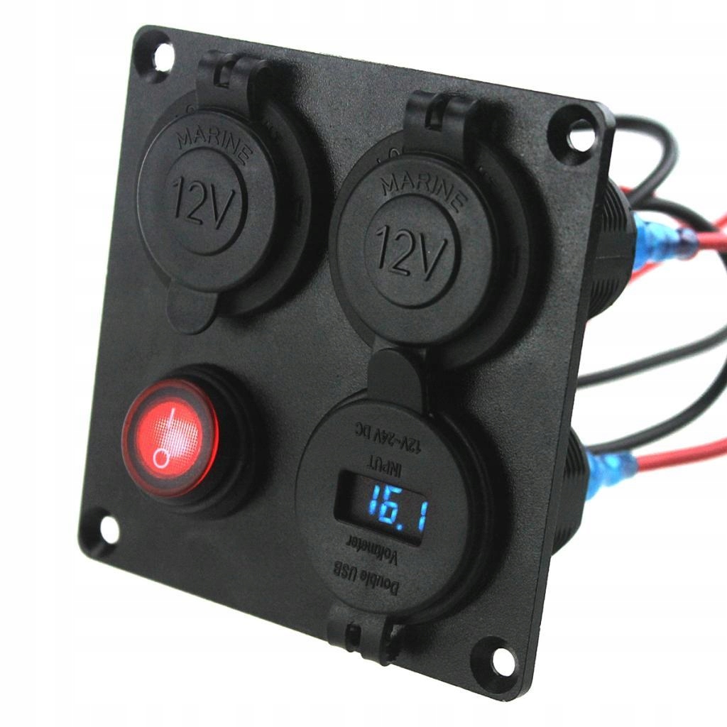 Эта панель с четырьмя отверстиями содержит 2 USB-разъема для зарядного устройства (выход: 5 В постоянного тока / 2,1 А) + вольтметр + розетка 12 В (выход: 12 В постоянного тока) + тумблер, они взаимозаменяемы.