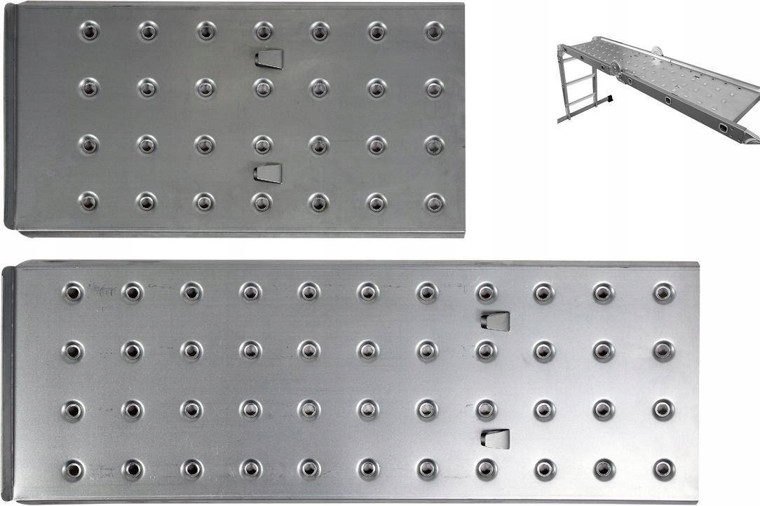 Площадка из 2 частей для многофункциональной лестницы 4х3 (ВОРЕЛ 17704). В комплект входят размеры 56х29,5 см и 83х29,5 см. Они изготовлены из прочного оцинкованного стального листа и выдерживают нагрузку до 150 кг. На многофункциональной лестнице VOREL 17704 вы получаете площадку размером 140х29,5 см. Такая большая полезная площадь снижает необходимость частого перемещения лестницы, что существенно ускоряет работу. Кроме того, пользователь может размещать необходимые материалы и инструменты рядом друг с другом, что существенно повышает комфорт работы и избавляет от необходимости прерывать работу и спускаться с лестницы. Платформы имеют противоскользящие выступы, снижающие риск падения. Монтажные крюки защищают платформы от смещения во время работы.