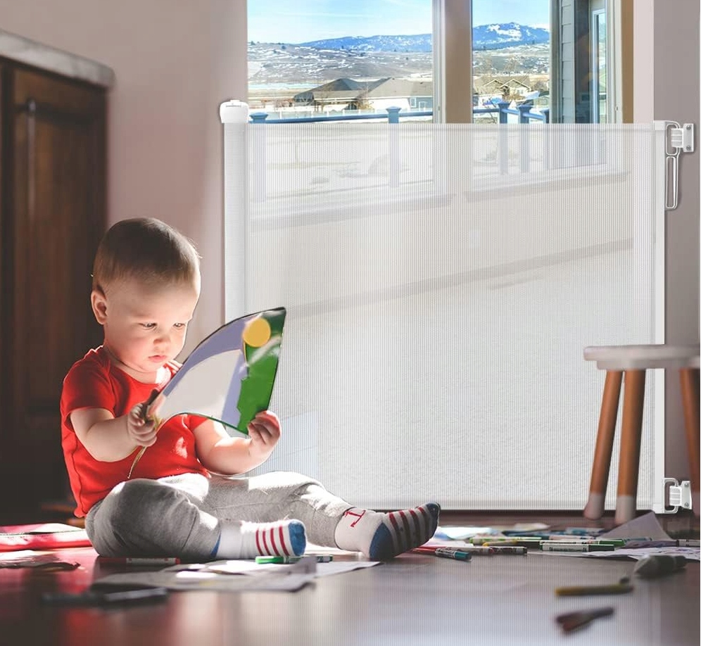 БЕЗОПАСНОСТЬ ДЕТЕЙ И ЖИВОТНЫХ: Эти ворота представляют собой универсальное решение. решение для домашней безопасности, удерживающее вашего ребенка и домашних животных вдали от опасных лестниц и ограниченных зон, обеспечивая безопасную и независимую игровую среду. Мягкая и прочная сетка защищает вашего ребенка от случайных ударов, и вы и ваш ребенок не споткнетесь о какой-либо порог.