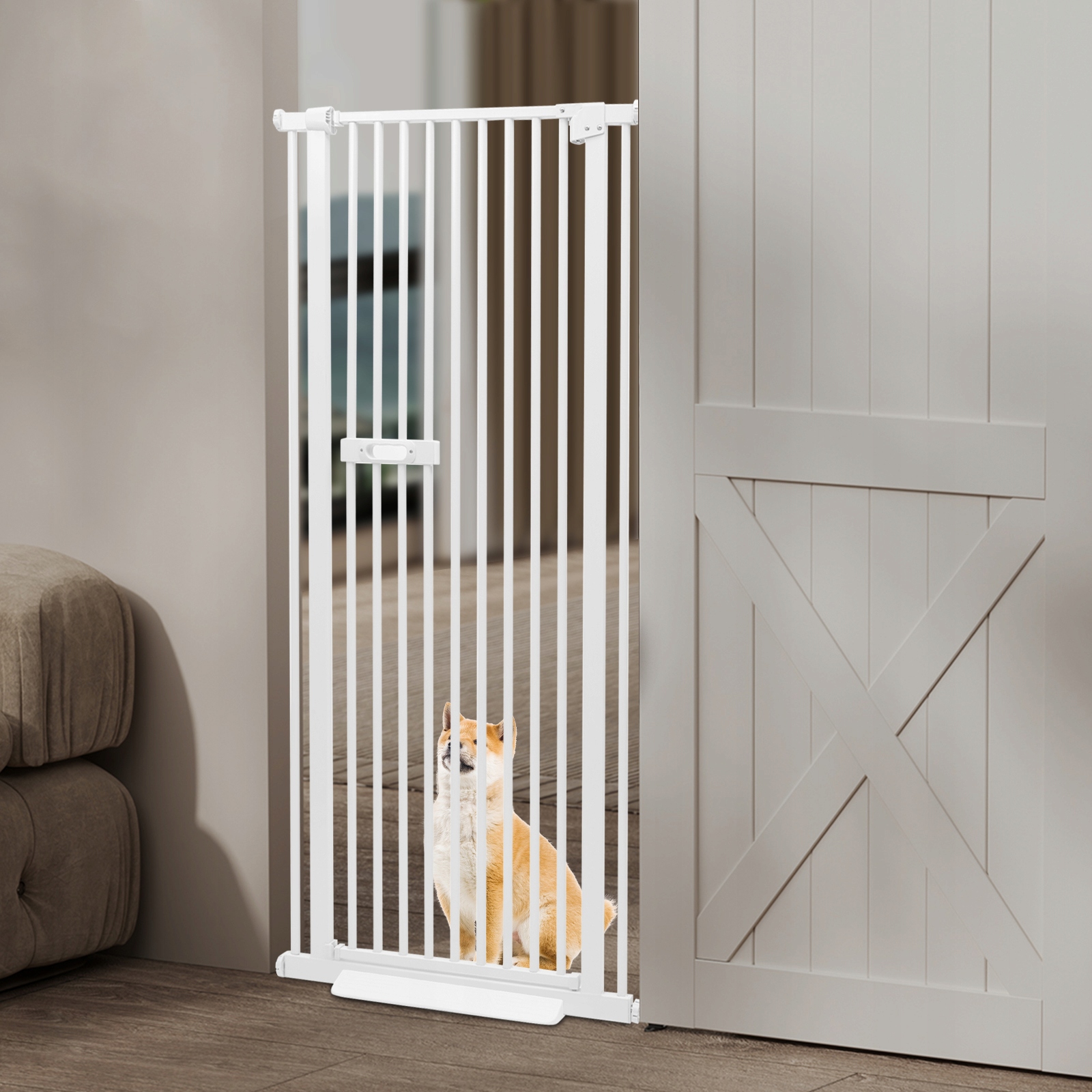 Высокая безопасность: высота 59 дюймов эффективно предотвращает перепрыгивание кошек и собак. Расстояние между прутьями в 1,38 дюйма слишком мало, чтобы дети и домашние животные могли пройти сквозь него или застрять головой, что делает его более безопасным в использовании. Кроме того, двойная система блокировки сверху и снизу обеспечивает еще более надежное закрытие.