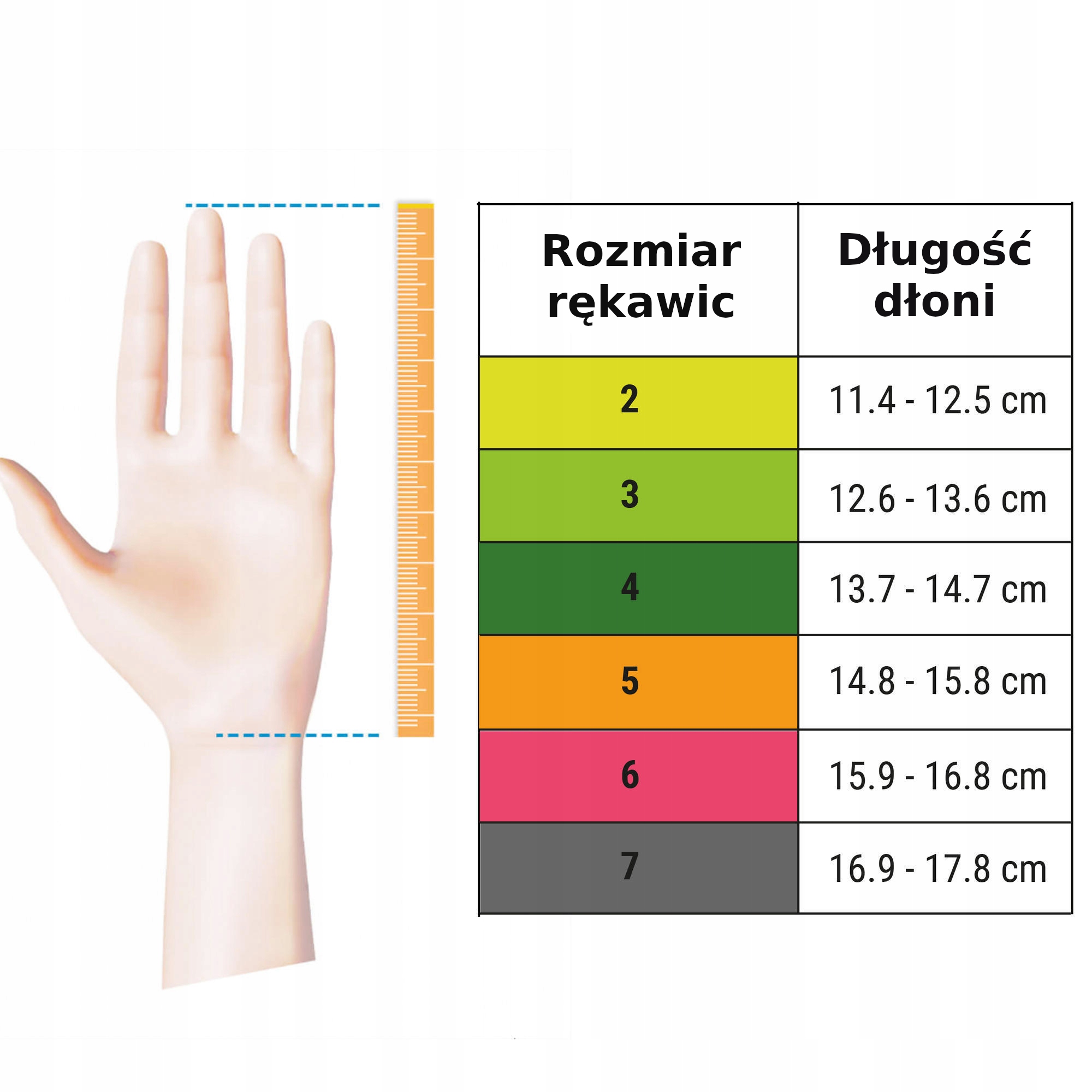 Чтобы правильно выбрать размер перчаток, измерьте длину руки от запястья до конца самого длинного пальца.
