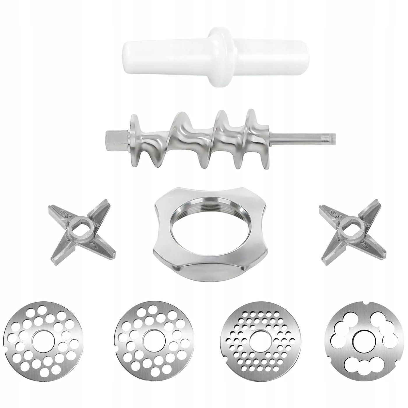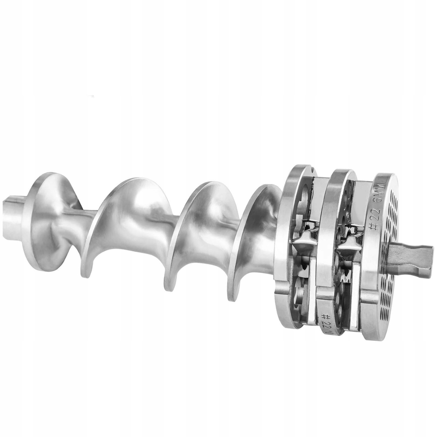 Оригинальный дизайн и набор аксессуаров значительно облегчают работу. Мясорубка имеет два сита диаметром сетки 10 мм, одна - диам. 6 мм, измельчитель 36 х 16 мм, прочный шнековый питатель, два четырехлапых ножа и пластиковый толкатель. Машина опирается на нескользящие и не царапающие резиновые ножки. Элементы привода смазываются в масляной ванне, что увеличивает срок их службы. Охлаждение обеспечивается эффективным вентилятором.