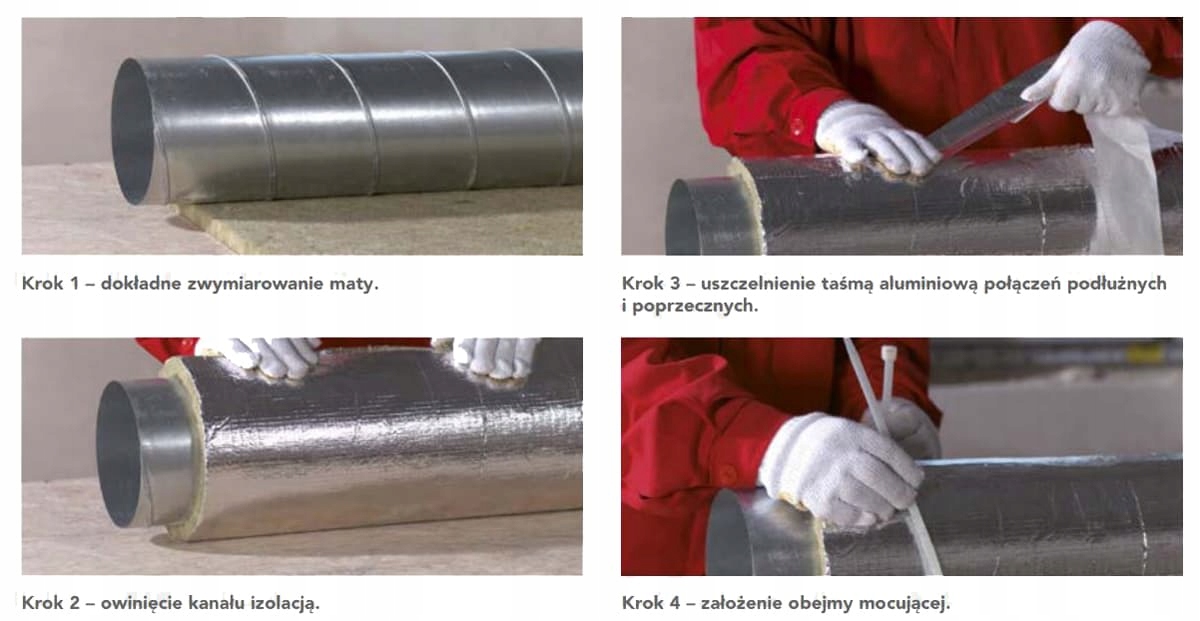 ✔ В случае круглых воздуховодов (гладких или спиро) воздуховод обертывается подходящим по размеру KLIMAMAT / ALU LAMELLA MAT мат, а затем все соединения проклеиваются алюминиевым скотчем. Клеевые соединения следует армировать монтажным хомутом или стальной проволокой. Отдельные этапы сборки показаны на фотографиях ниже.