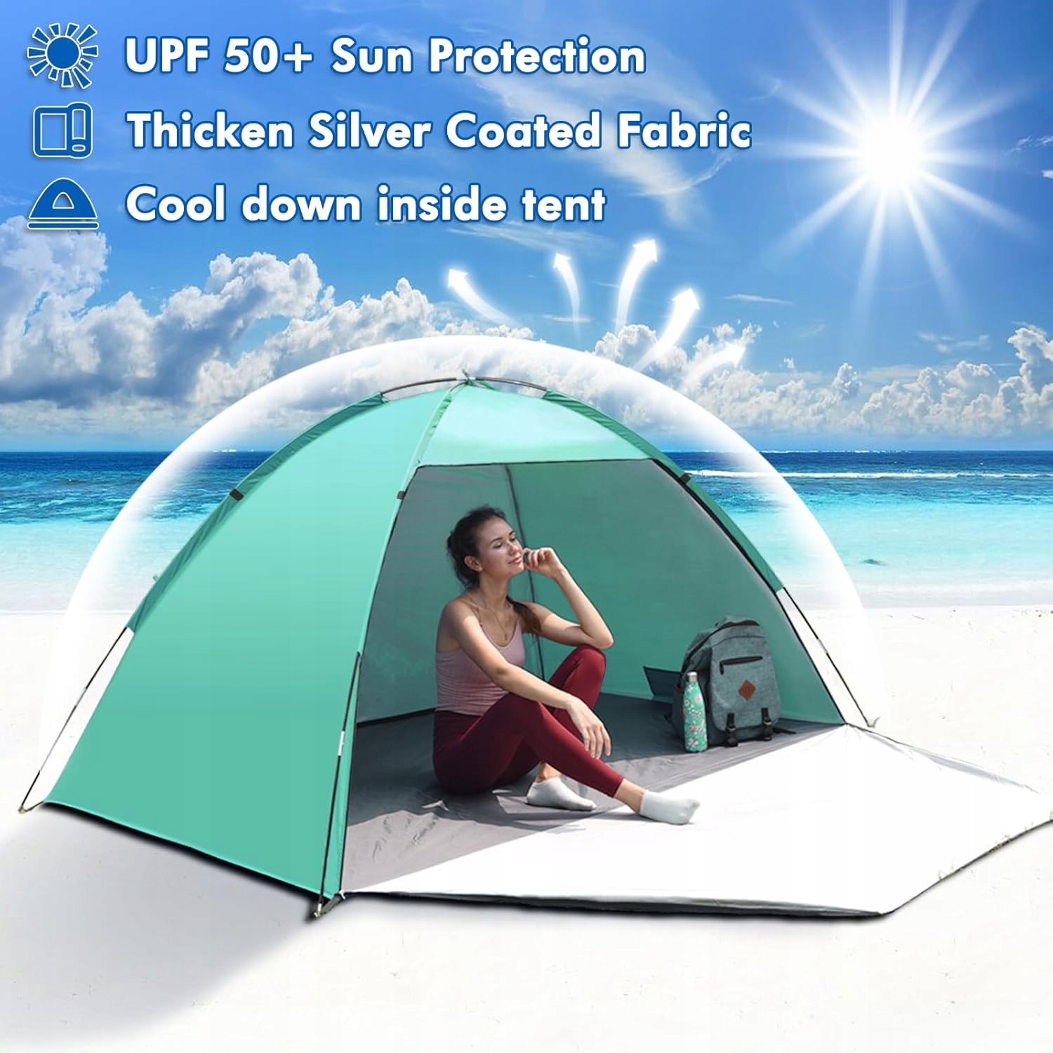 качественные материалы: пляжная палатка изготовлена из 190 -т ткани, покрытой защитным слоем с сопротивлением излучения ультрафиолетового излучения, обеспечивающего эффективную защиту от вредных эффектов солнца. Сильная рама из стекловолокна, покрытая прочной тканью Oxford 210D, гарантирует стабильность и долговечность конструкции