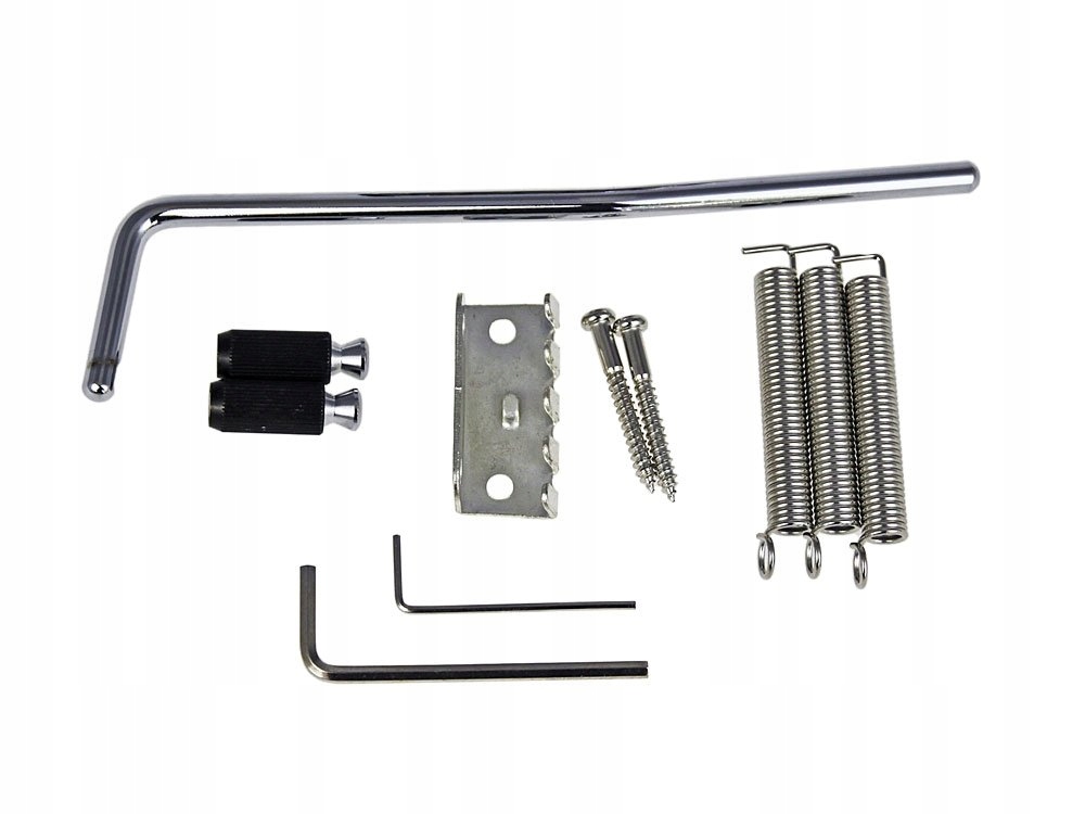 В комплект входит запрессованный рычаг тремоло, пружинный крючок с крепежными винтами, 3 пружины, 2 штифта и шестигранные ключи для регулировки.