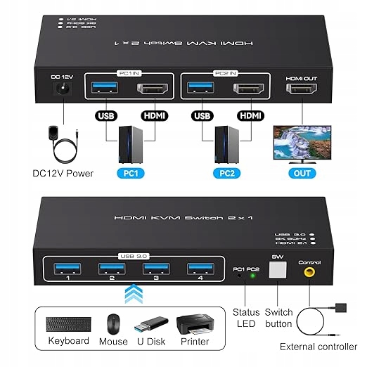 VPFET 8K60HZ KVM Switch HDMI USB 3.0 для 2 ПК и 1 монитор