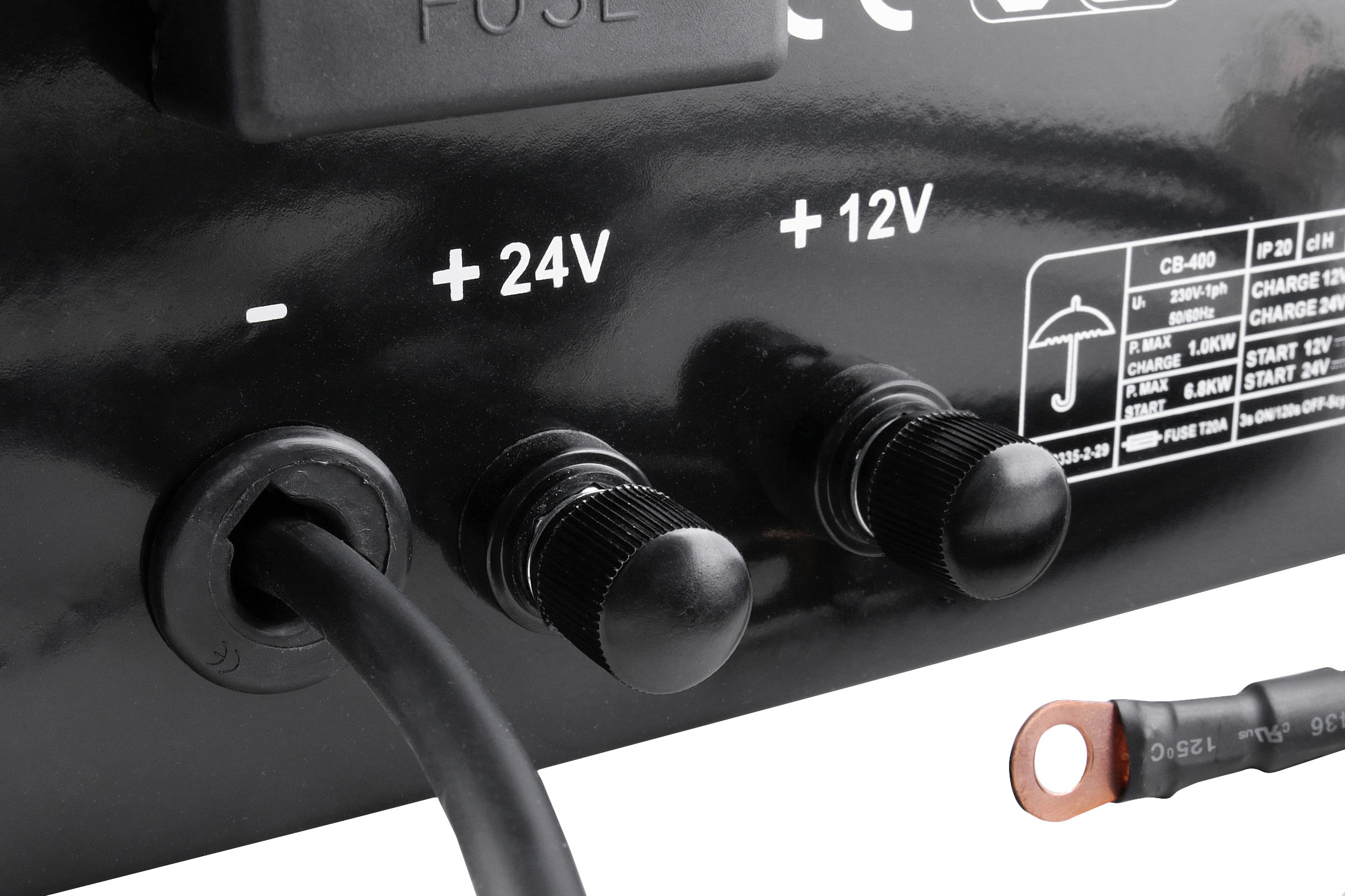 Устройство подходит для зарядки как 12В, так и 24В. Выпрямитель может заряжать как одну батарею, так и несколько. В зависимости от способа подключения мы можем заряжать несколько батарей, подключенных параллельно напряжением 12 В (или 24 В, если батареи имеют такое напряжение), или две батареи 12 В, соединенные последовательно. В этом случае подключите плюсовой кабель к выходу 24 В.