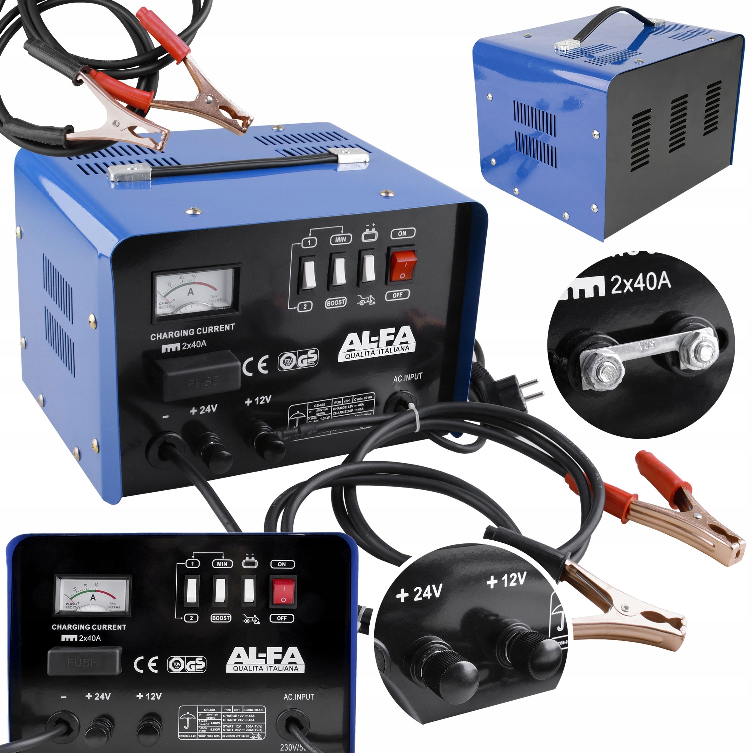 Устройство предназначено для зарядки аккумуляторов напряжением 12В и 24В емкостью от 20Ач до 500Ач. Использование многоступенчатого управления зарядкой и запуском на базе переключателей позволяет осуществлять быструю зарядку аккумуляторов большой емкости, когда время имеет решающее значение, а также медленную зарядку малым током. Такое решение позволяет долгое время сохранять аккумулятор в отличном состоянии и предотвращает его повреждение.