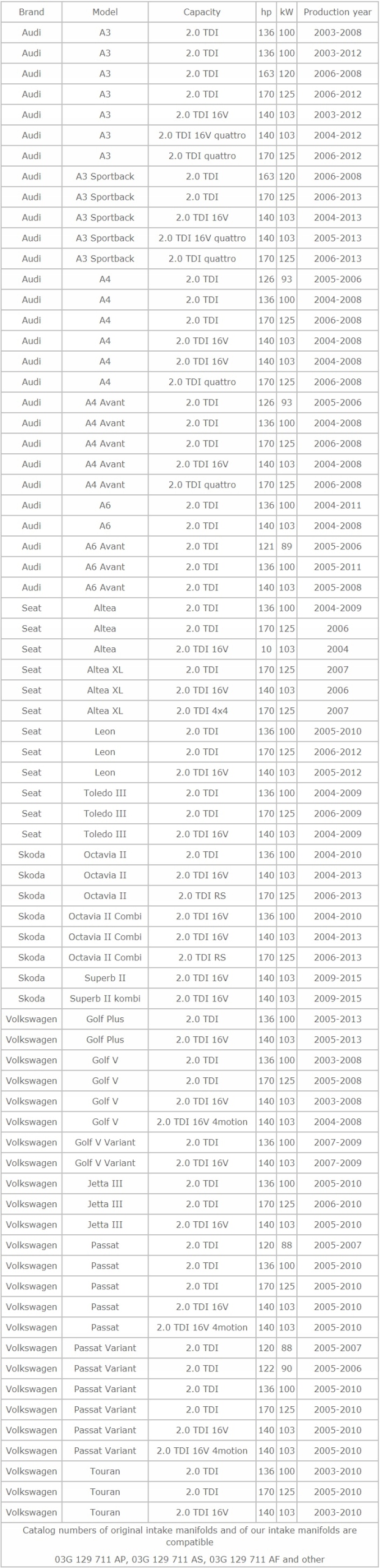 Коллектор подходит для автомобилей группы Volkswagen с двигателями насос-форсунки