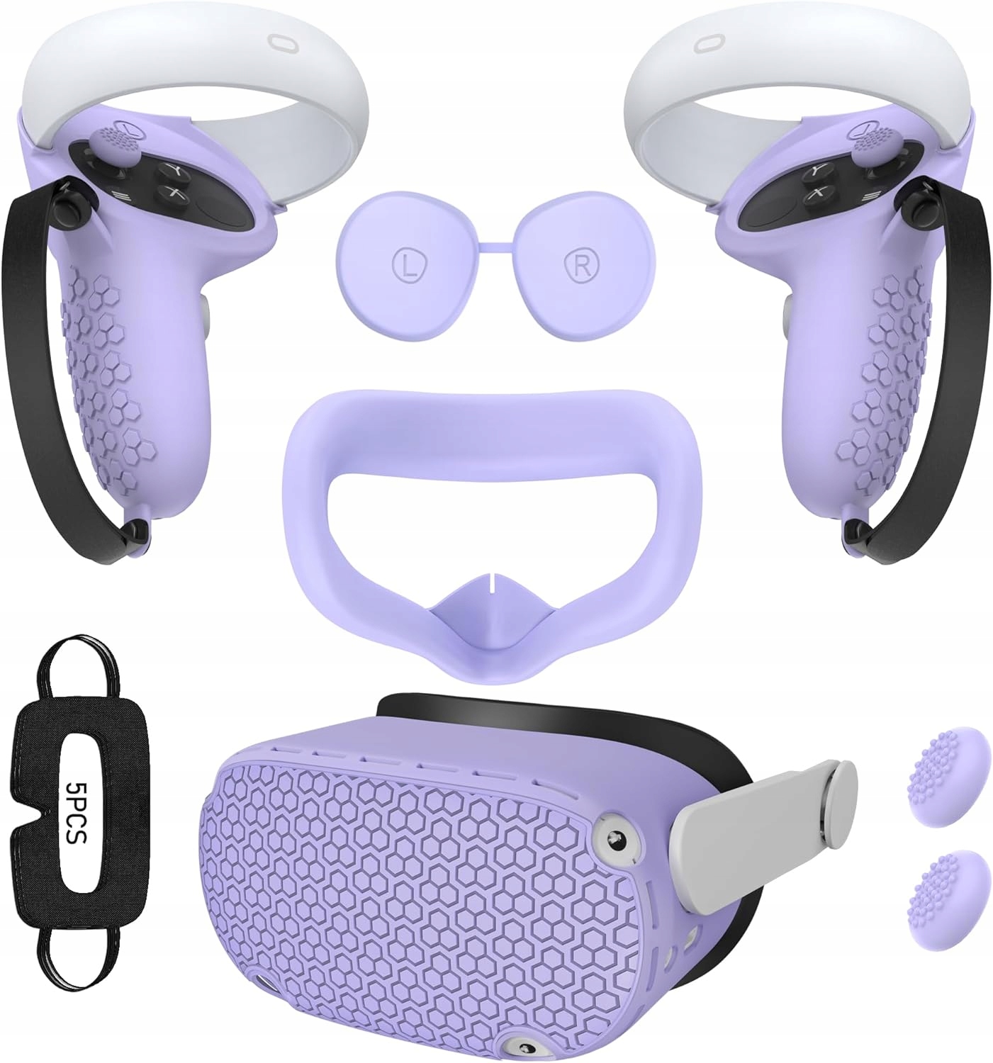 В комплект входят лицевая панель Quest 2, крышка корпуса VR, крышки для ручек контроллера, крышка объектива, защита для больших пальцев и одноразовые крышки для глаз, обеспечивающие комплексную защиту и улучшенные впечатления от игры.