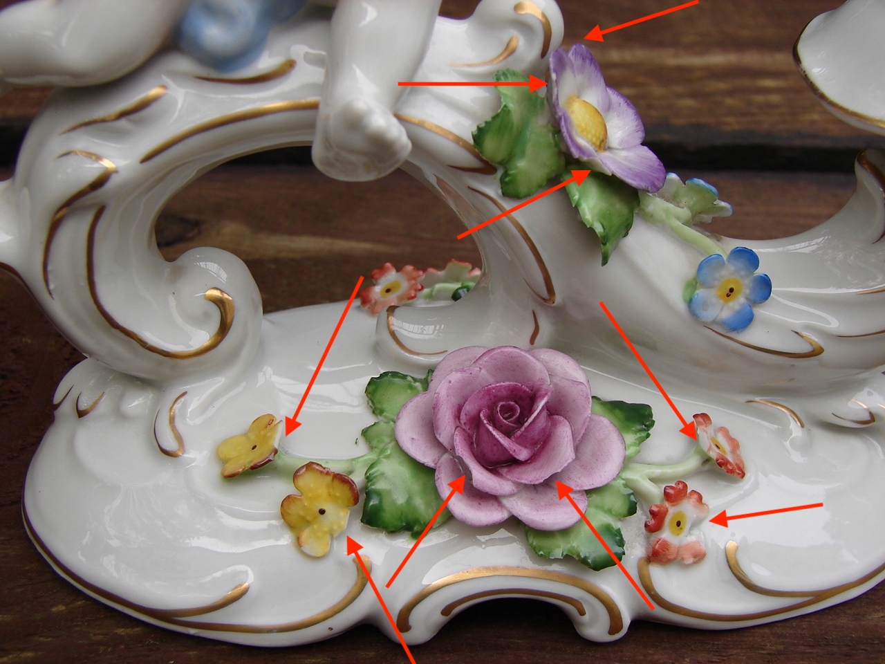 Подсвечник не имеет трещин, только растительный орнамент имеет локальные дефекты, которые при увеличении видны красными стрелками. Представленные дефекты не умаляют очарования подсвечника.