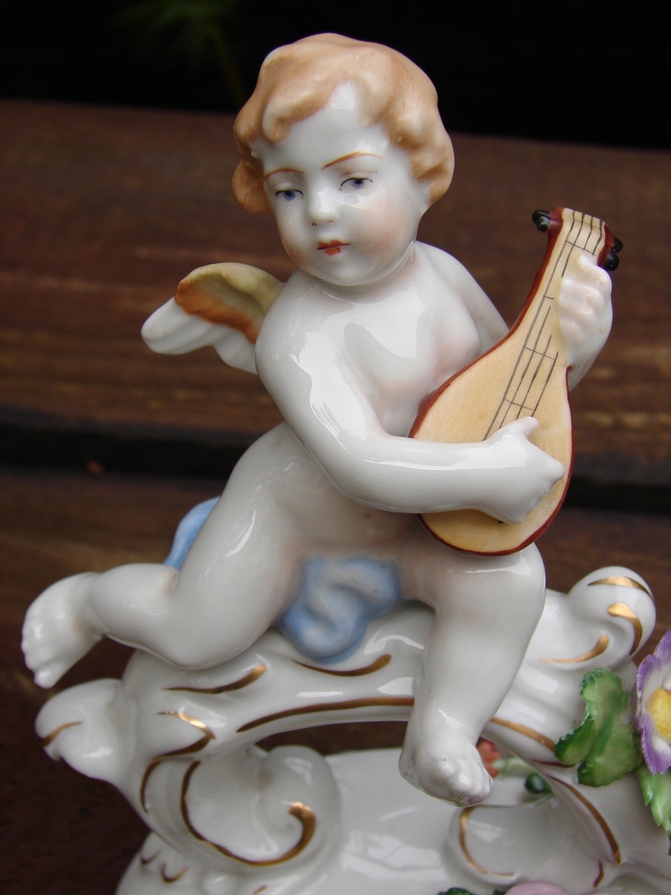 Центральный элемент - херувим с мандолиной, помещенный на декорированном волнистом плече подсвечника.