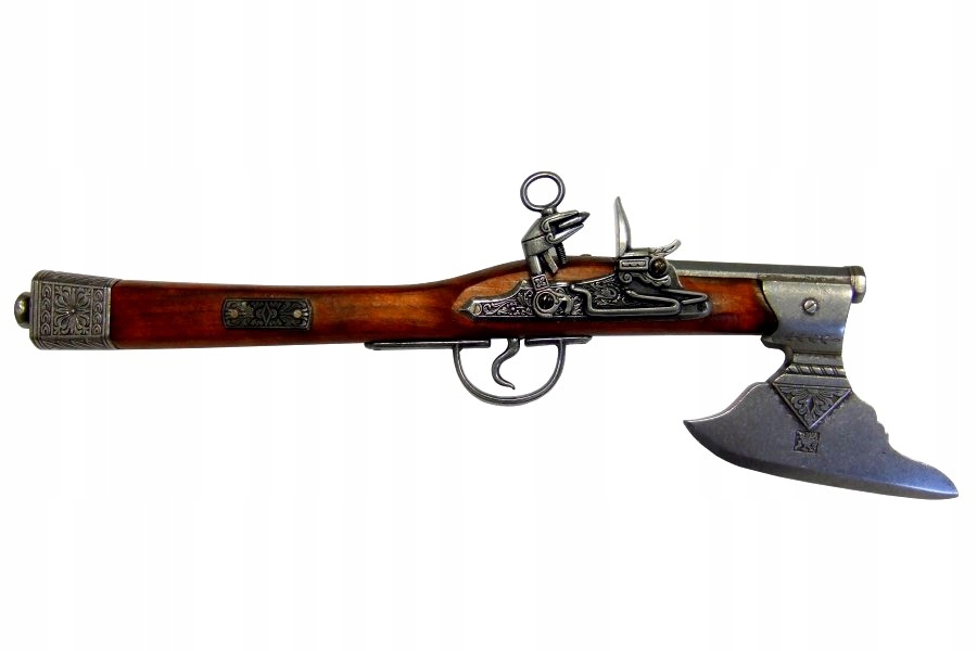 Реплика, изготовленная в сочетании дерева и металла - алюминиевый цинк сплав. Закончено с богато украшенными металлическими элементами. В то время, после стрельбы, пистолет был практически бесполезен. Немецкие мастера пытались решить эту проблему, и таким образом было создано значительное оружие в форме пистолета, соединенного с топором. Таким образом, после стрельбы солдату не нужно было тратить время на перезарядку, потому что у него было оружие в виде топора. Оружие и для всех тех, кто ценит элегантные гаджеты в своих квартирах или офисах. Отличное имя -день, день рождения или юбилейный подарок.