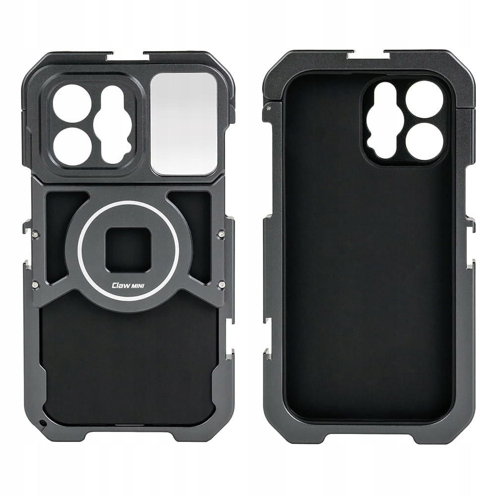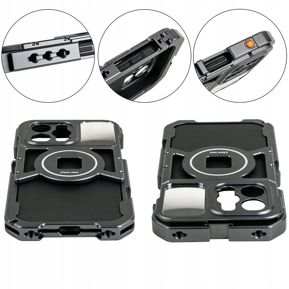 Корпус полностью соответствует стандарту MagSafe. Он также совместим с магнитно-механической системой крепления VRIG Claw Mini. Конструкция клетки обеспечивает удобный доступ к кнопкам и порту зарядки и никак не ограничивает функциональность нашего смартфона. На его задней стороне - рядом с отверстиями для объективов камеры - есть небольшое зеркало, которое облегчит нам управление кадром, когда мы будем снимать себя.